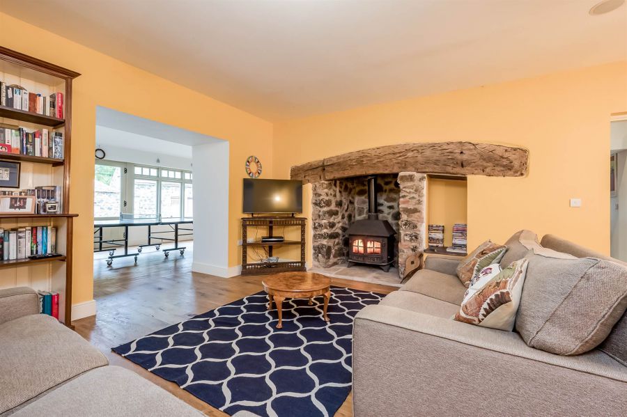 Two sets of wooden double patio doors leading to courtyard, feature stone and red brick exposed wall, recessed fireplace in red brick with stone hearth. Open plan to . . .