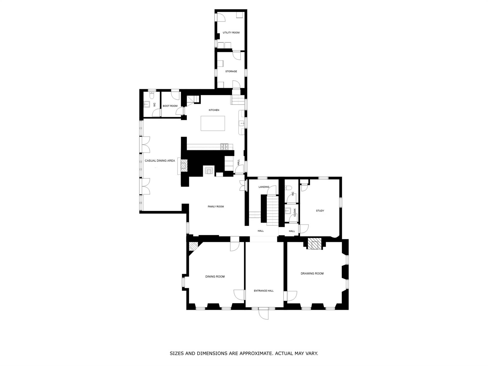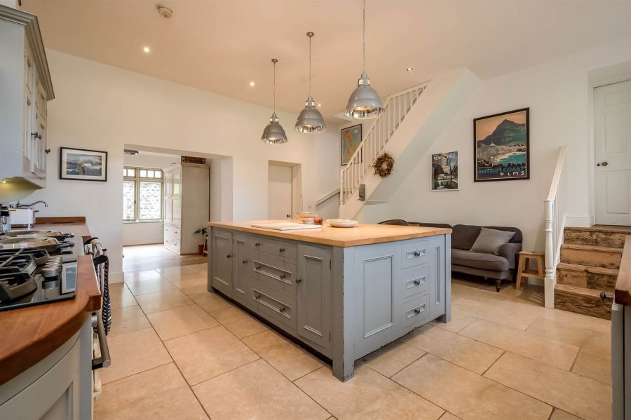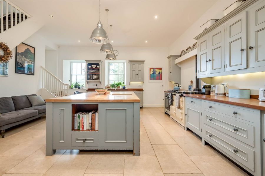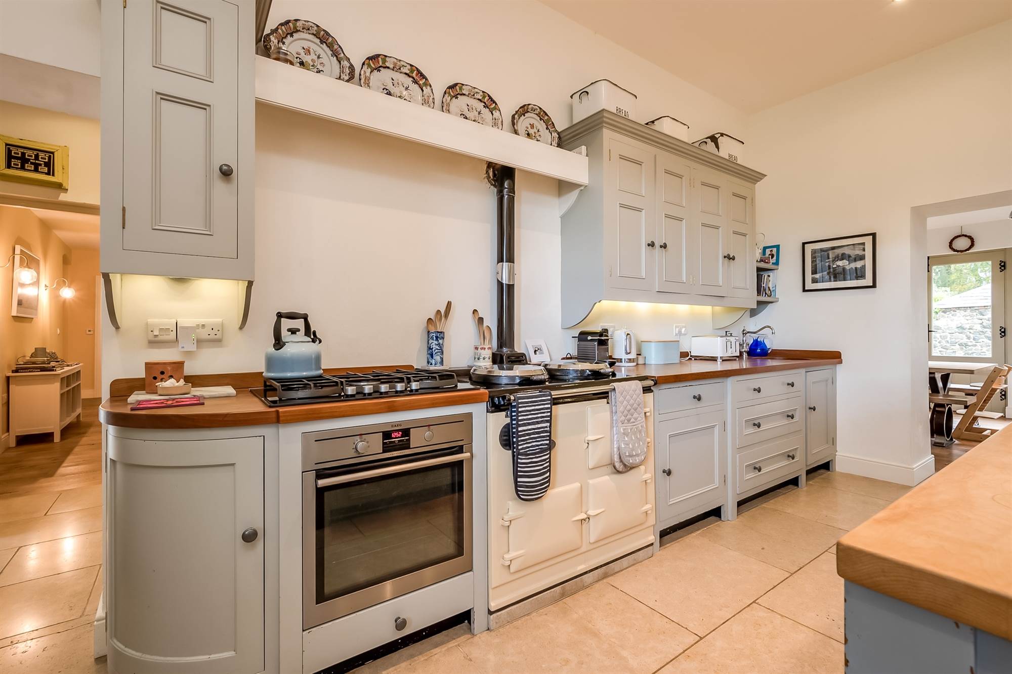 Bespoke hand painted kitchen with extensive range of storage, additional large bespoke island unit with breakfast bar area, two oven Aga, solid wood work surfaces, single Blanco sink unit, range of integrated appliances that include additional four ring gas hob, electric oven, dishwasher, larder cupboard, ceramic tiled floor. Staircase leading to first floor.