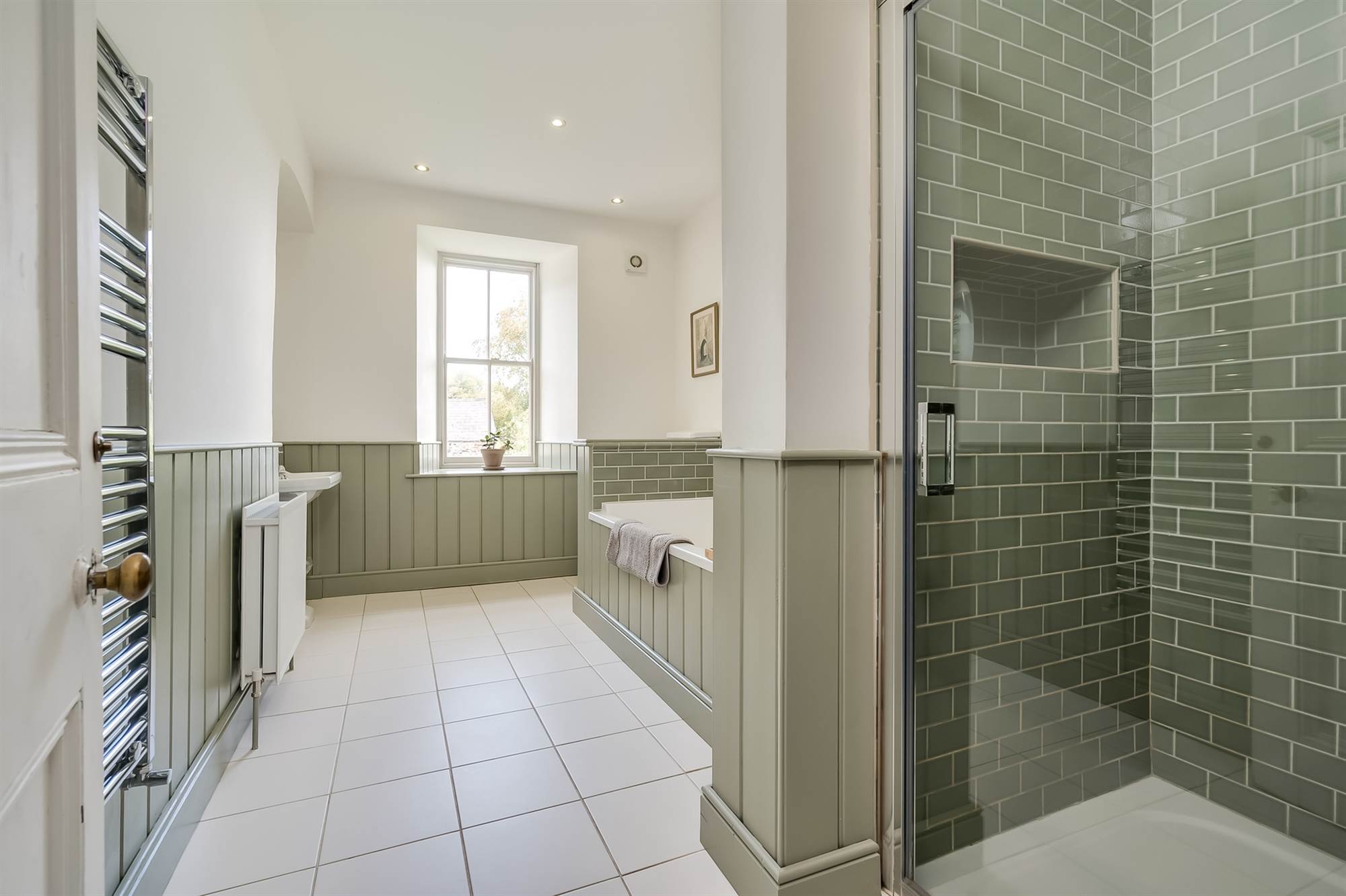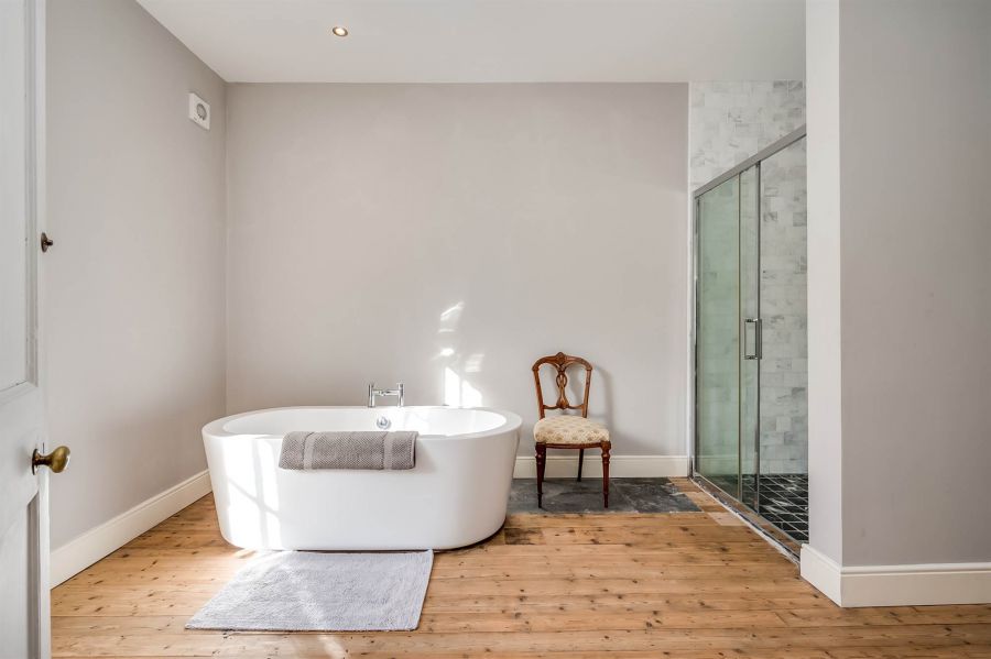 Comprising free standing bath, large fully tiled shower cubicle, low flush wc, double sink vanity units, tiled splash back, towel rail, extractor fan, solid wooden shutters to windows, solid wood strip flooring.