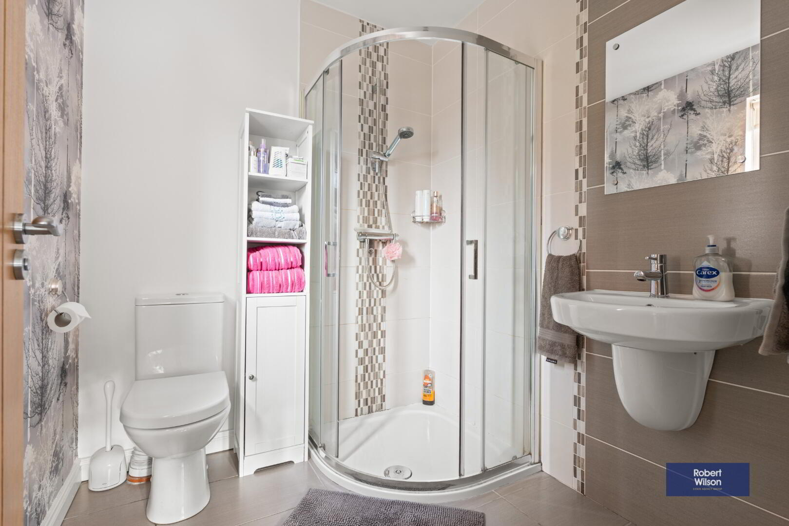 White suite comprising; low flush w.c., wall hung wash hand basin, walk in shower cubicle with thermostatic valve, part tiled walls, tiled floor, extractor fan, double panel radiaitor.