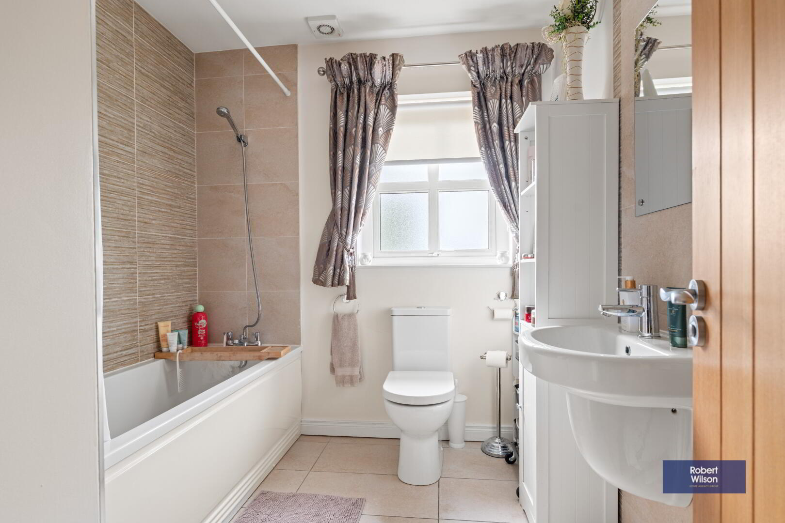 White suite comprising; low flush w.c., wall hung wash hand basin, panel bath tub, part tiled walls, tiled floor, double panel radiator, recessed lighting, extractor fan.