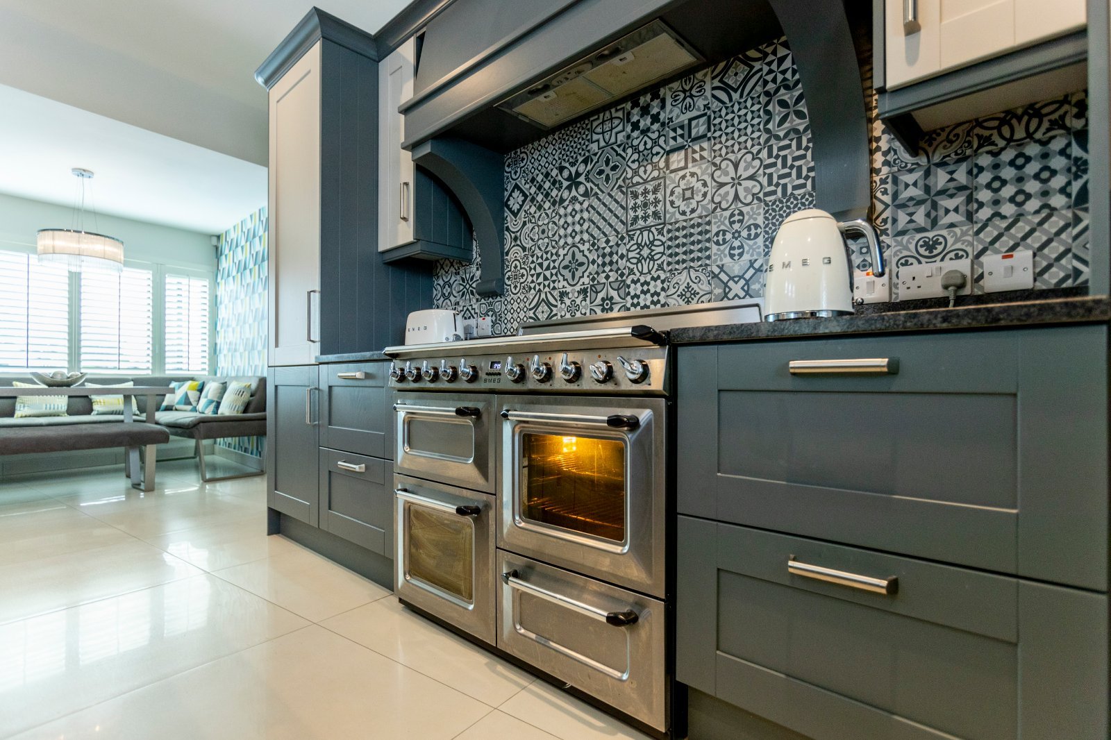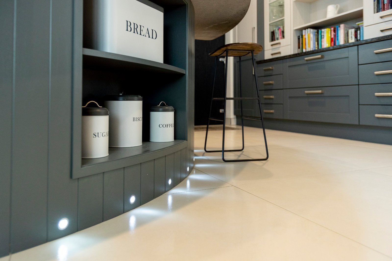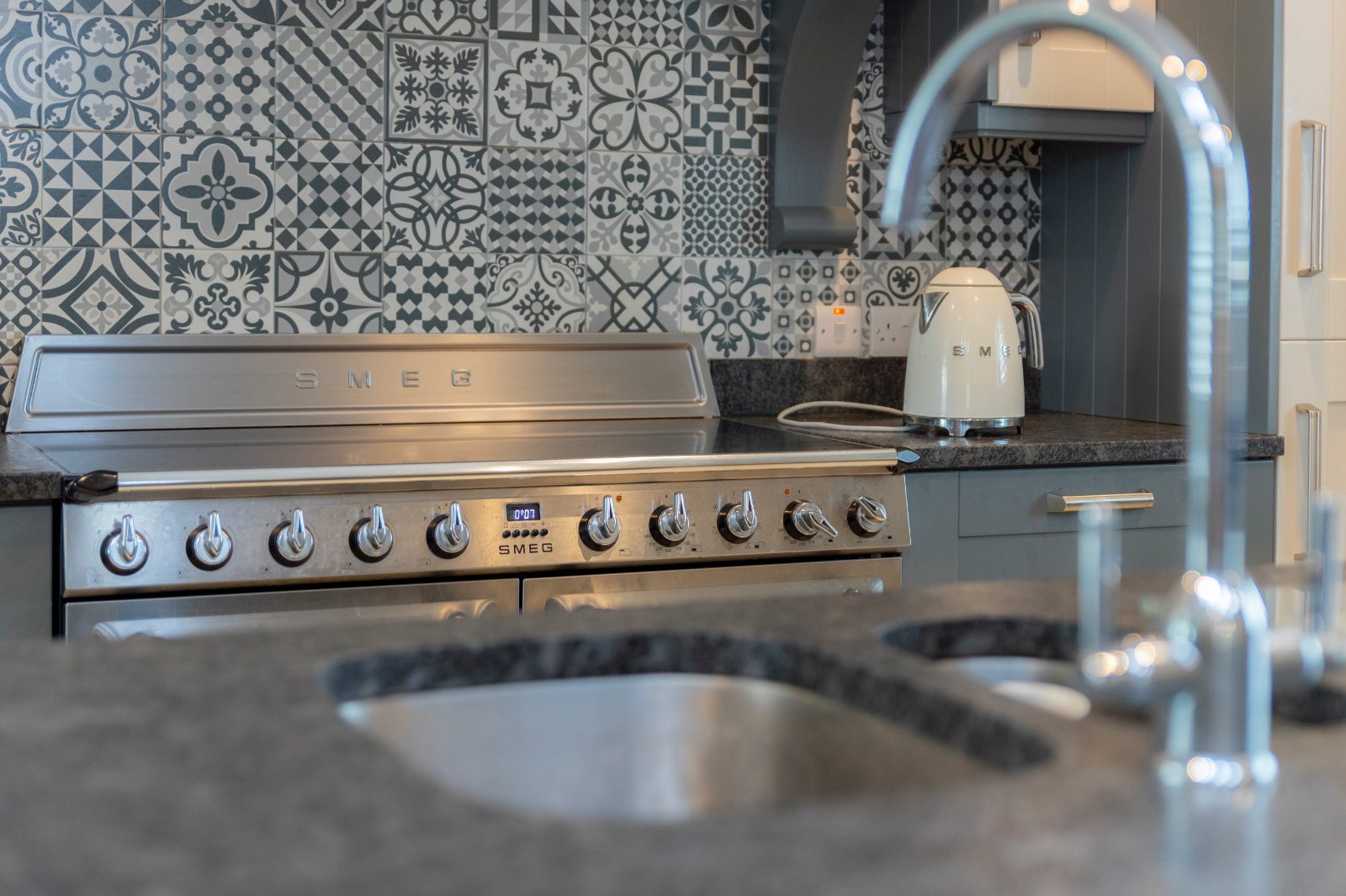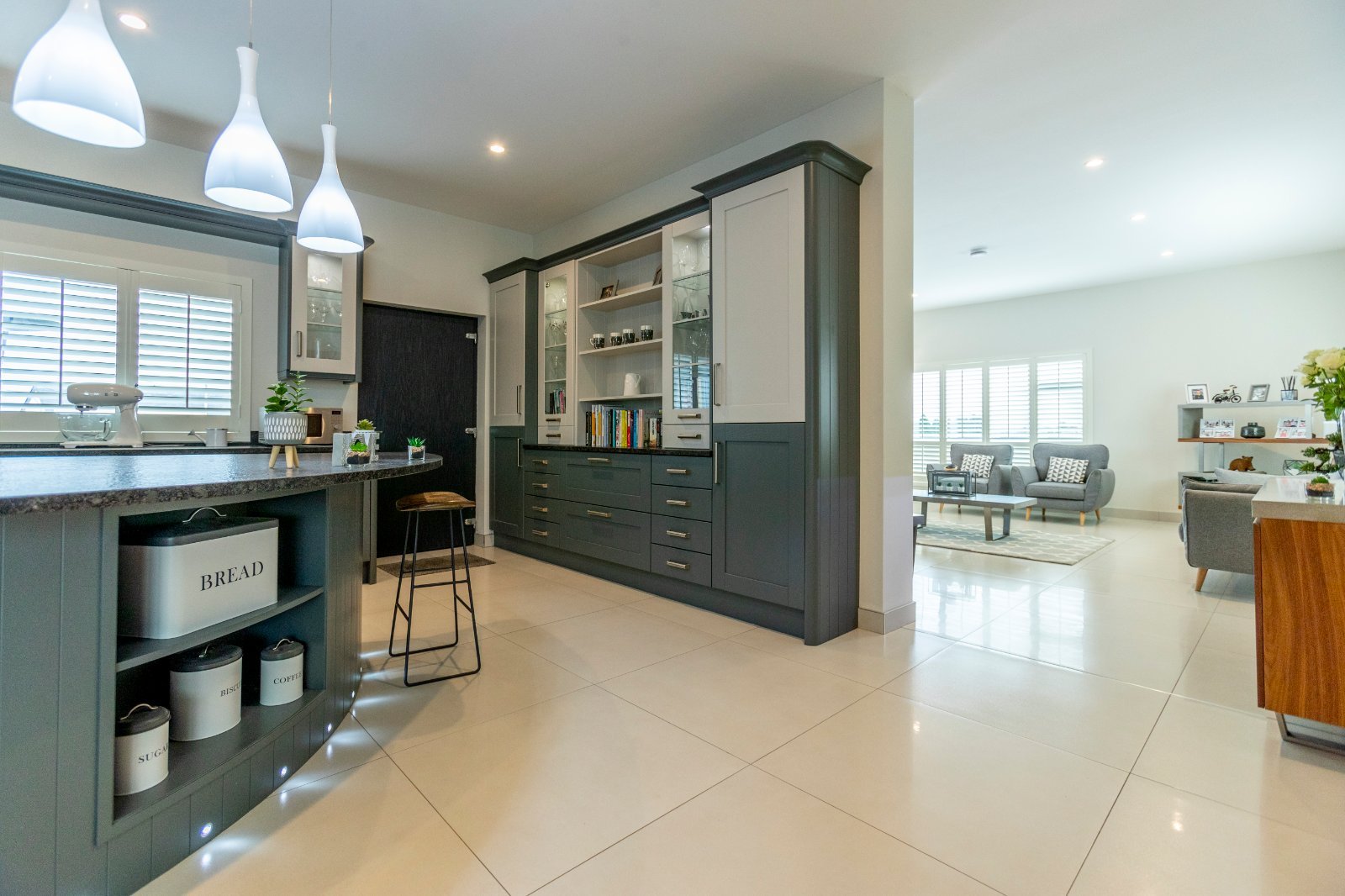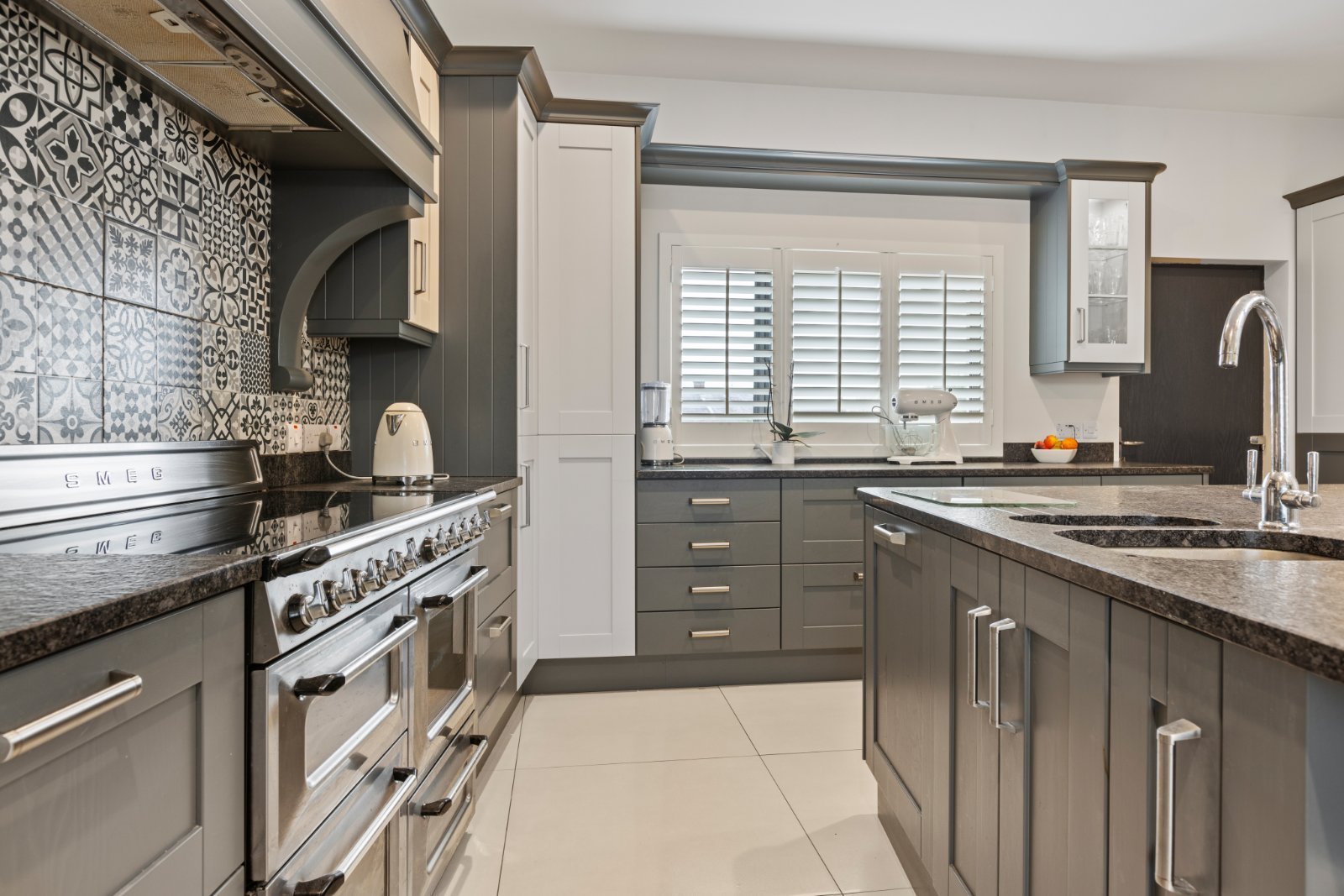 Includes range of bespoke Shaker style units in contrasting Graphite and Cornforth White with chrome and glass displays. Quarter moon shaped island unit with 1 ¼ sunken sink units and granite worktops. Integrated washing machine and dishwasher. LED lighting to kickboards. Granite effect worktops and up-stands to rest. Smeg oven unit with extractor fan. Fly-over above window. Integrated fridge/freezer and tumble dryer.