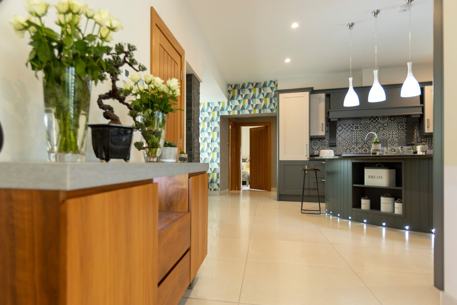 Includes tiled wooden effect flooring with up-stands. Range of units with granite effect worktops. Integrated fridge. Tea and coffee making area.