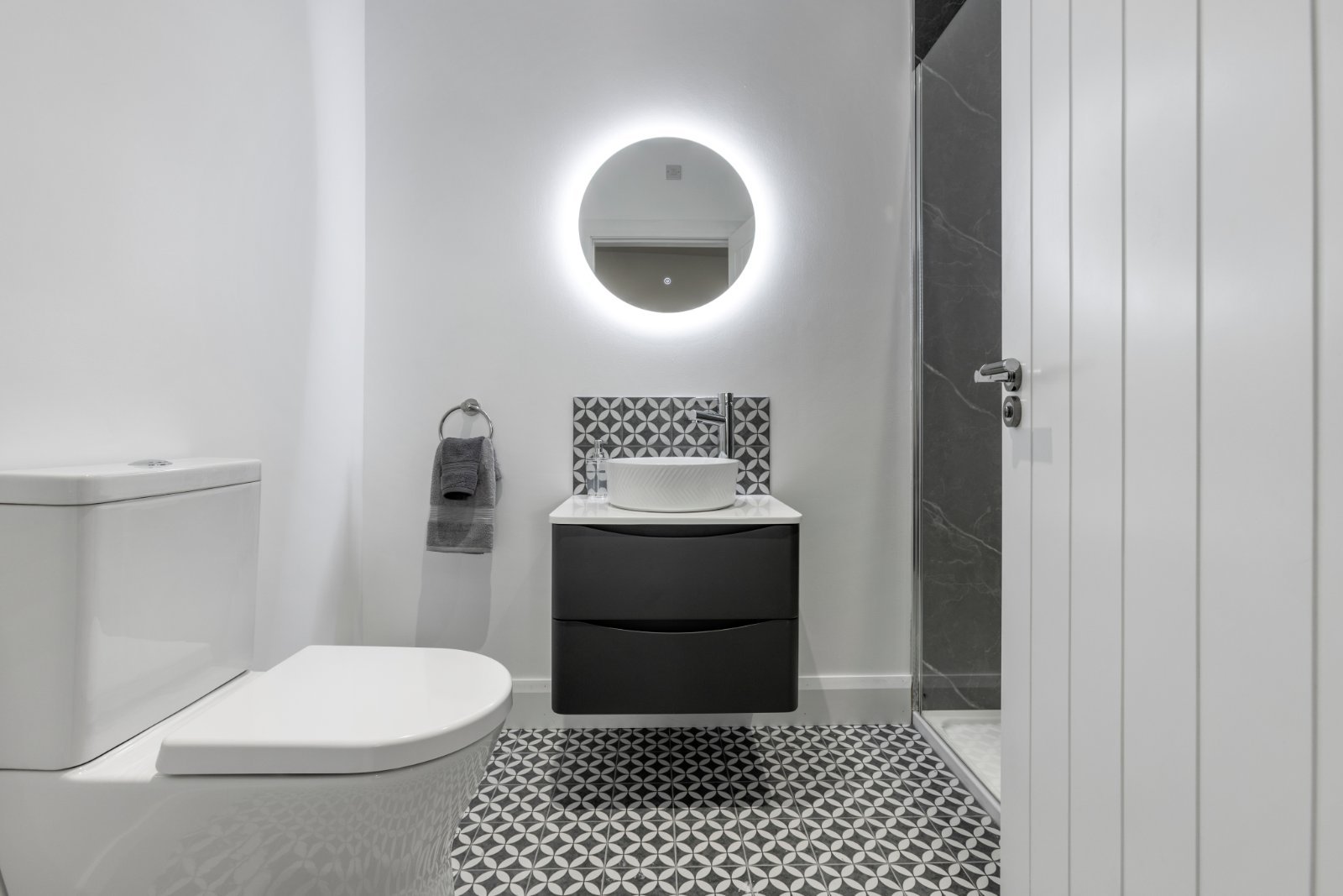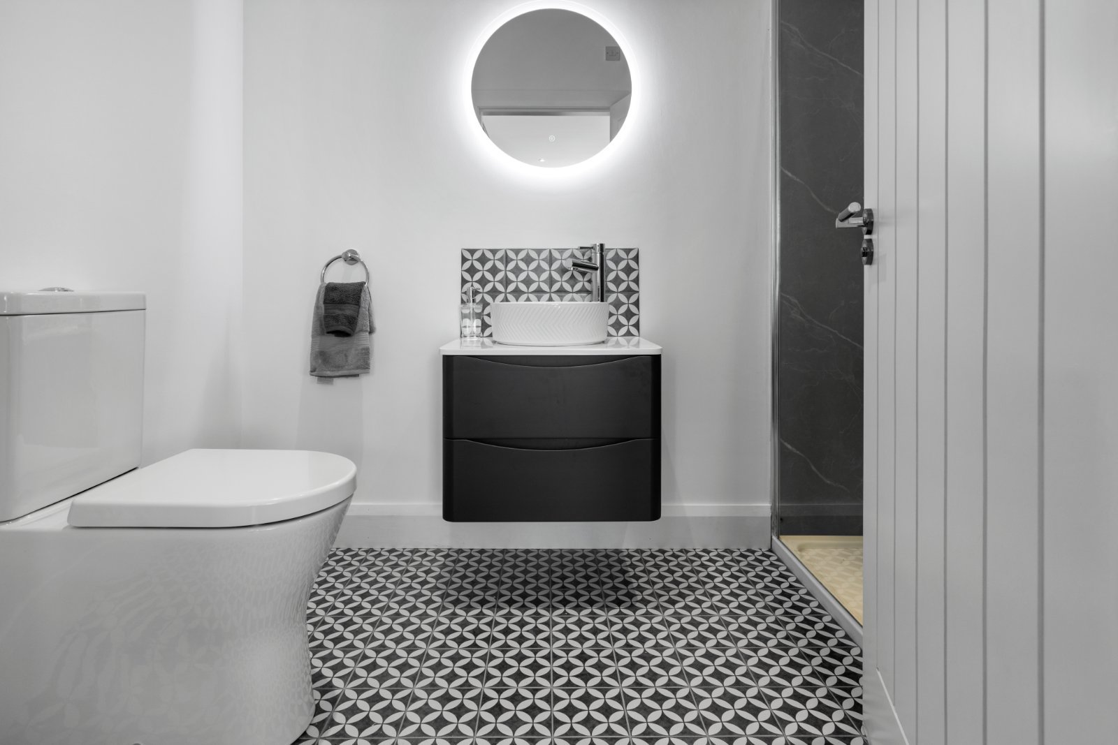 Contemporary suite includes white lfwc and wall mounted vanity whb with chrome accessories. Blue tooth and WIFI connected light up mirror. Panelled double quadrant shower cubicle with rain shower head and separate attachment. Anthracite heated towel rail. Tiled flooring. Spotlights.