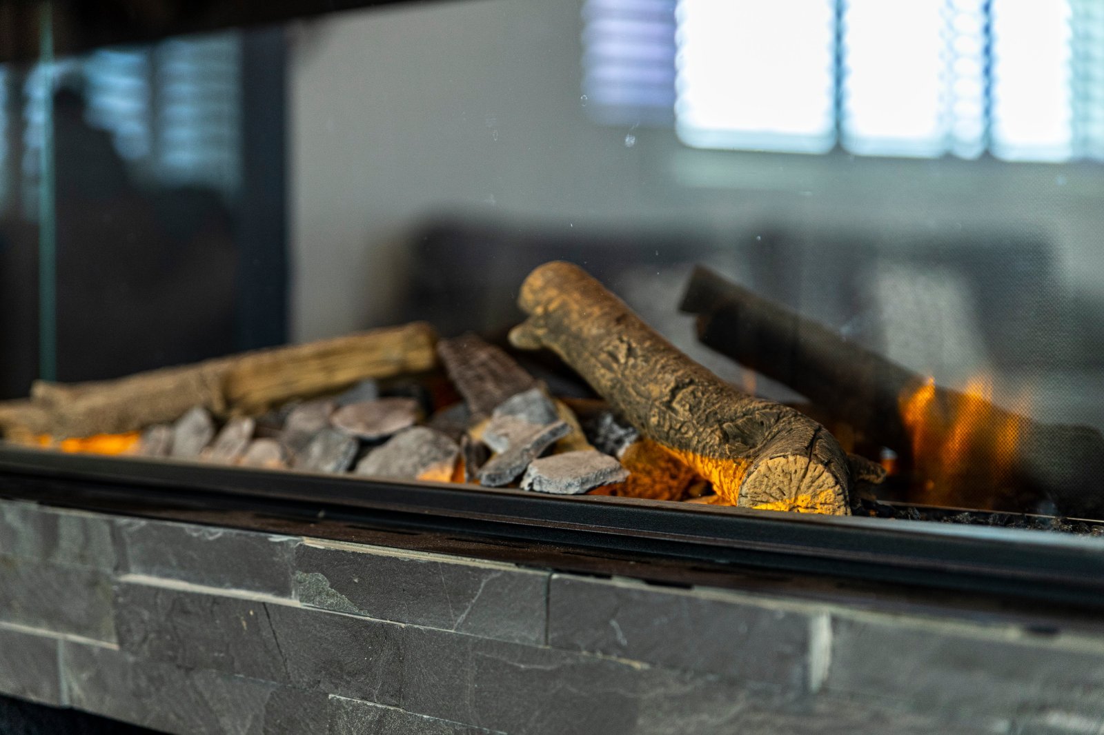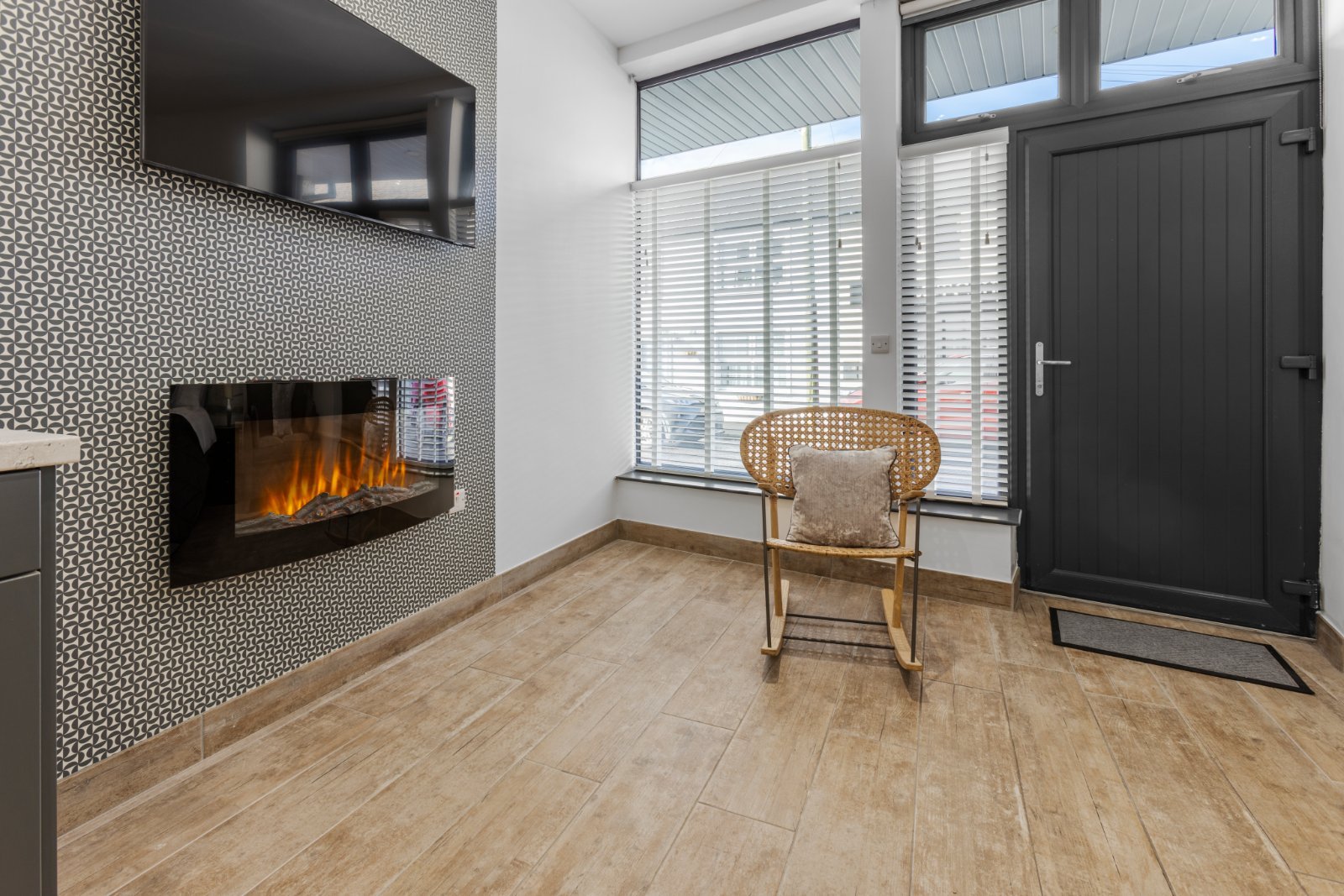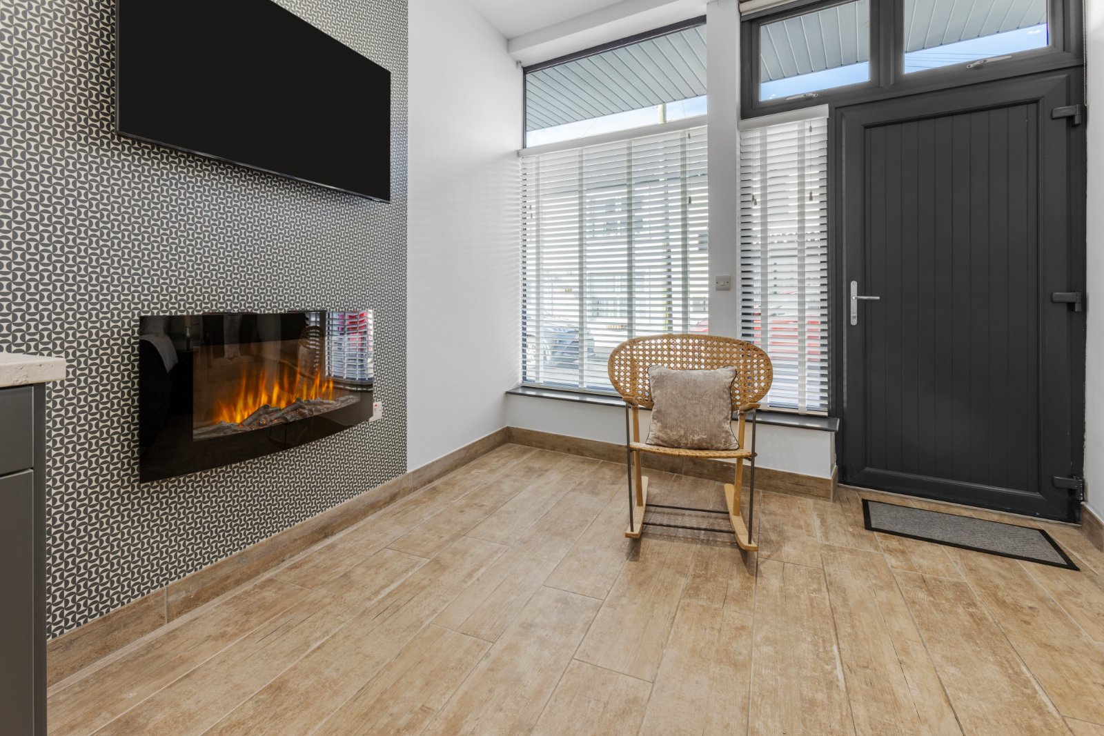 Includes recessed electric fire inset with floor to ceiling slate surround. Wood burning stove unit.