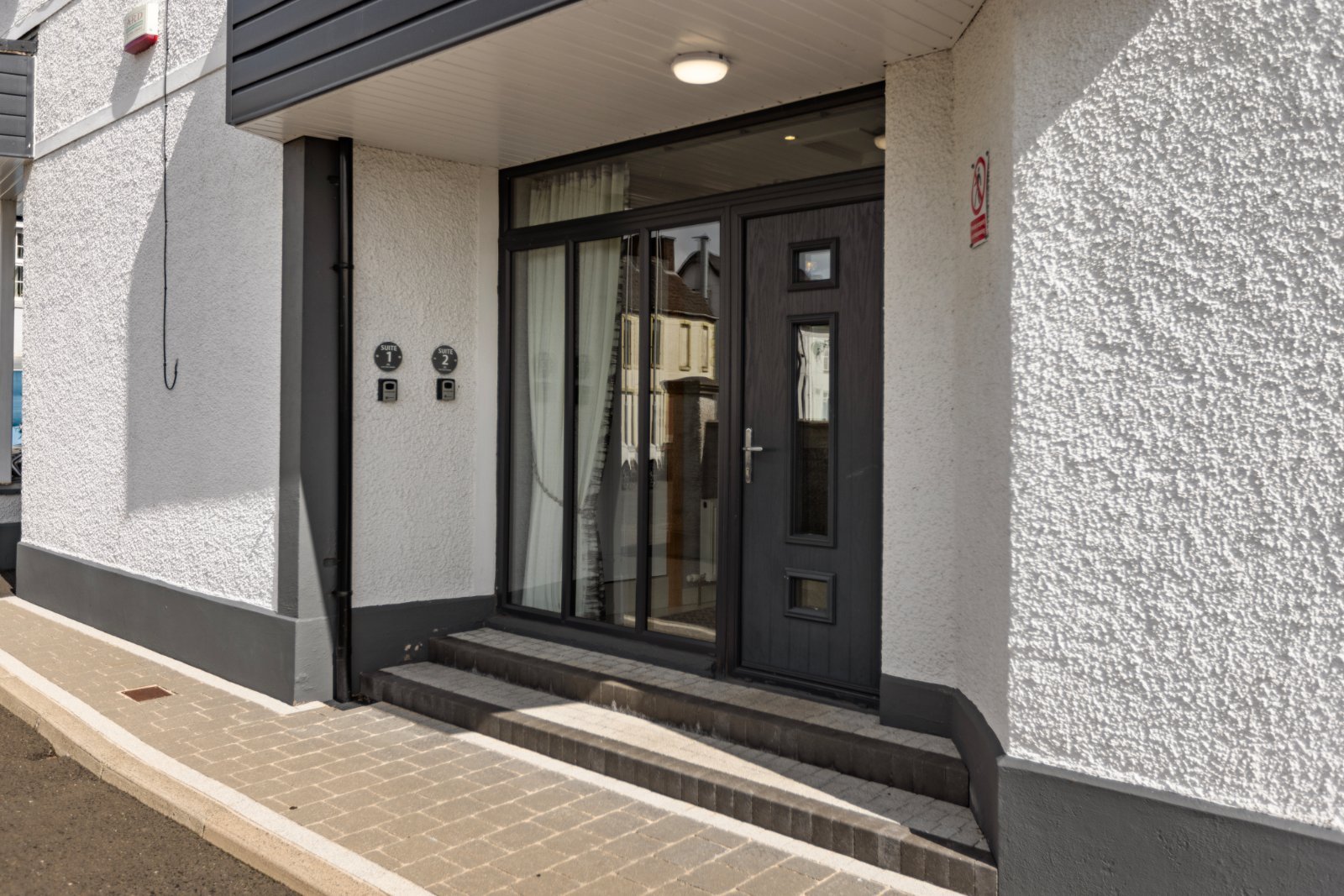 Porcelain tiled flooring leading to carpeted staircase. Access to First Floor Apartment and Four Ground floor units.