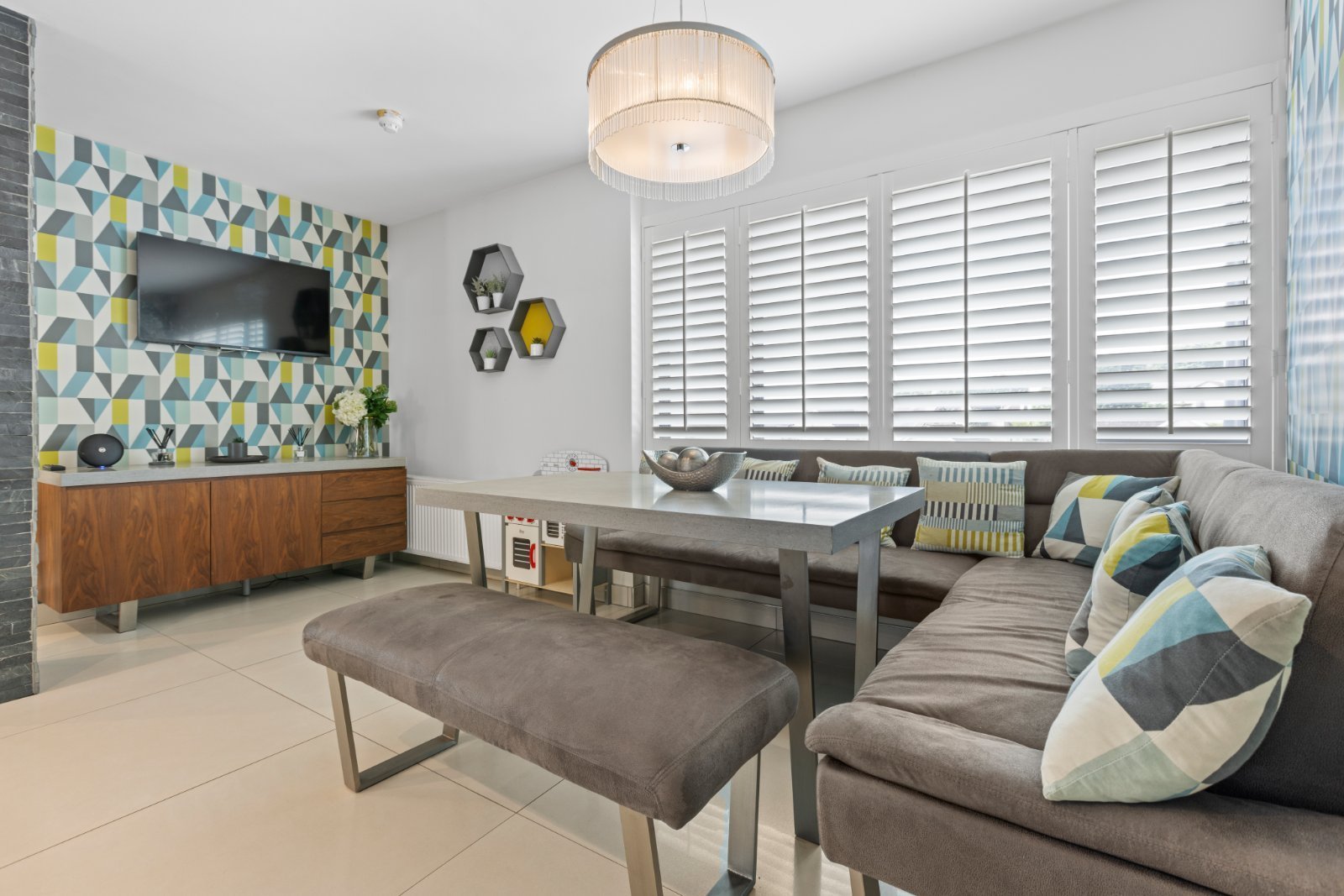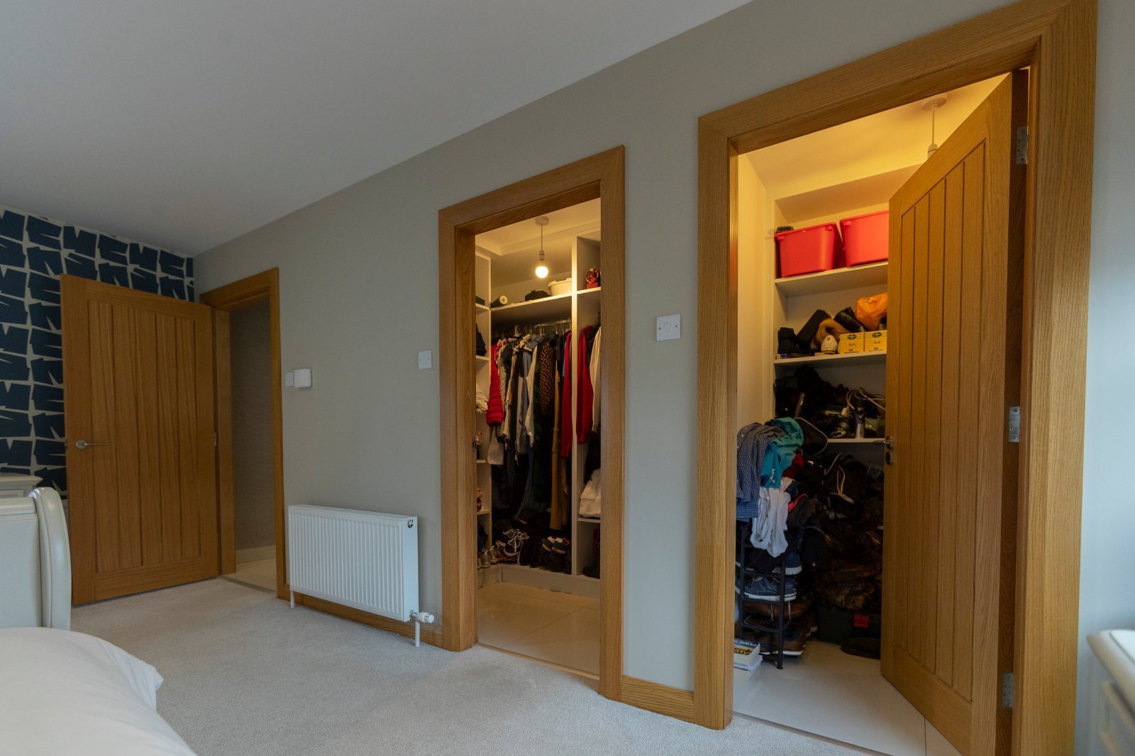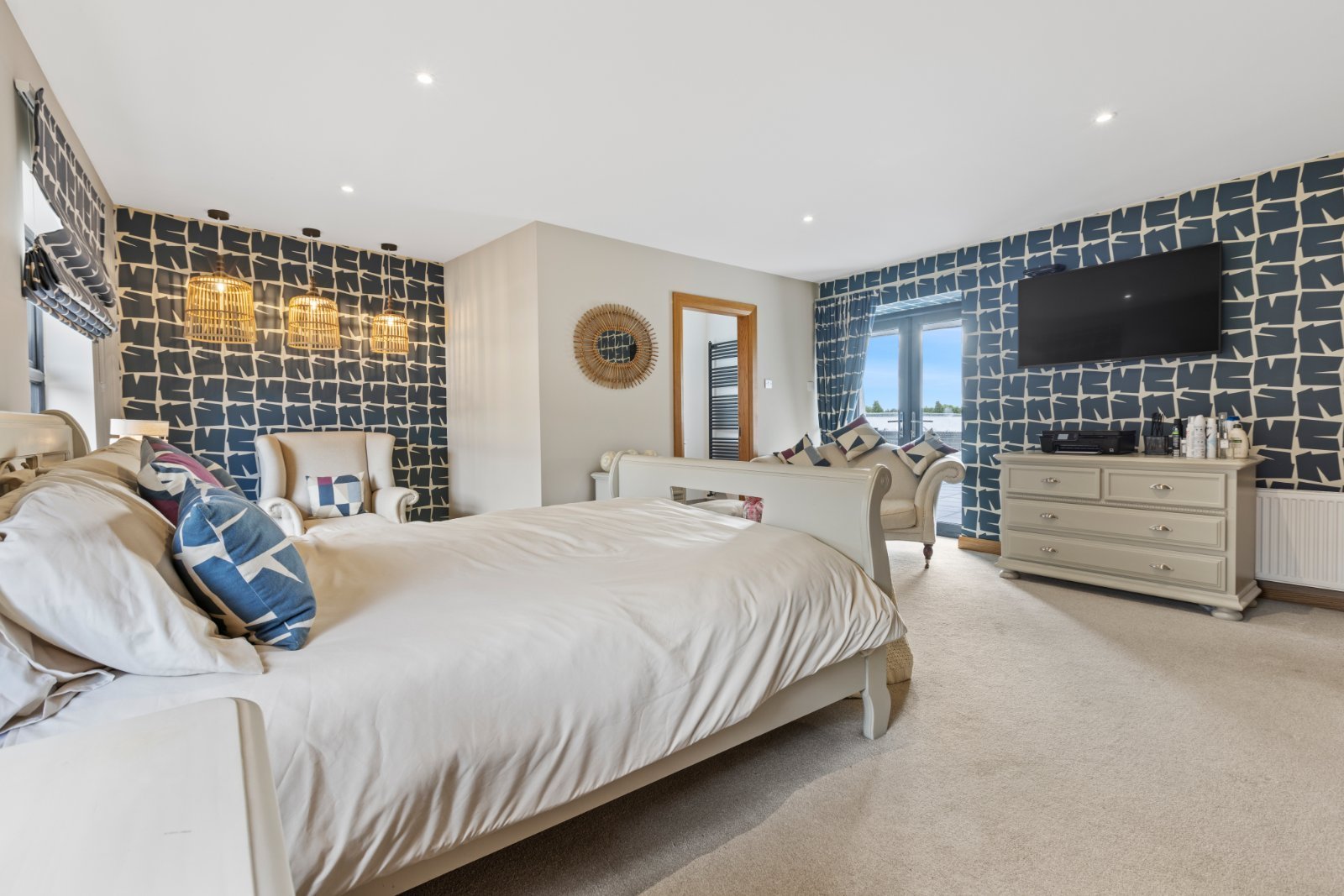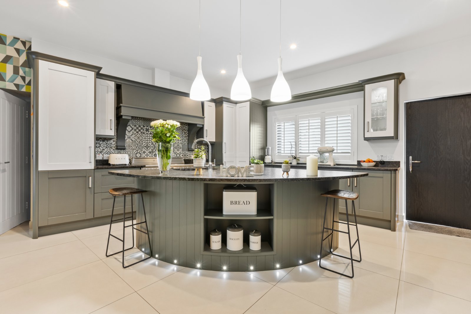 Includes range of bespoke Shaker style units in contrasting Graphite and Cornforth White with chrome and glass displays. Quarter moon shaped island unit with 1 ¼ sunken sink units and granite worktops. Integrated washing machine and dishwasher. LED lighting to kickboards. Granite effect worktops and up-stands to rest. Smeg oven unit with extractor fan. Fly-over above window. Integrated fridge/freezer and tumble dryer.