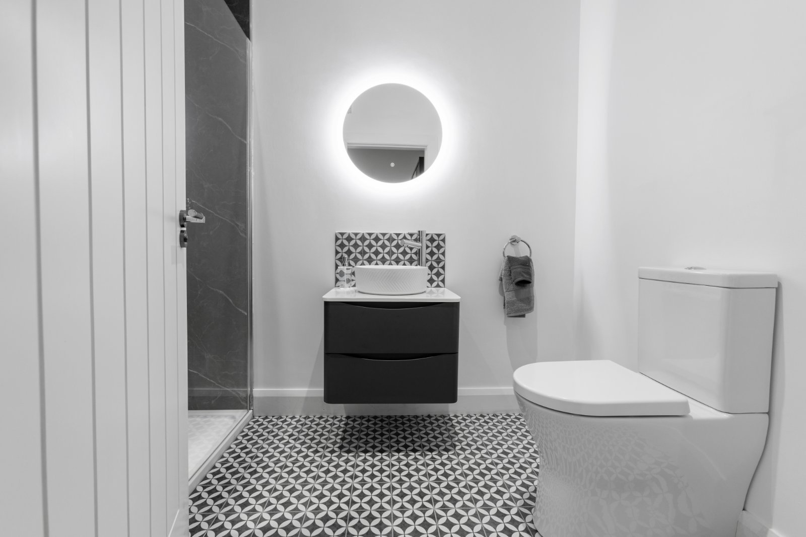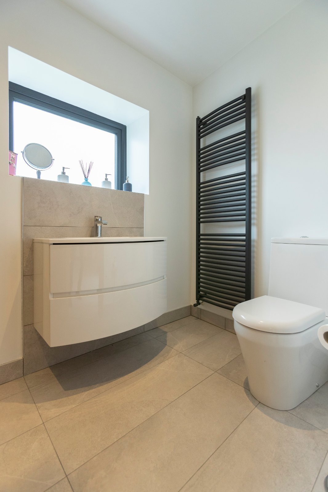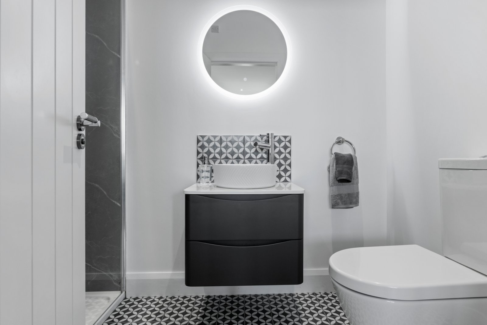 Contemporary suite includes white lfwc and wall mounted vanity whb with chrome accessories. Blue tooth and WIFI connected light up mirror. Panelled double quadrant shower cubicle with rain shower head and separate attachment. Anthracite heated towel rail. Tiled flooring. Spotlights.