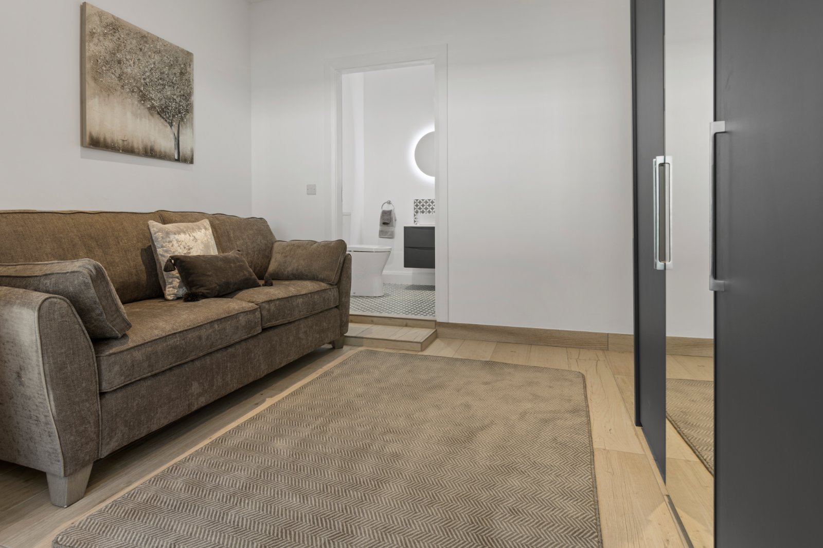 The ground level includes four luxury units with living space, kitchen area and en-suite facilities, with a gym and laundry for communal usage, and covers roughly 1900 square feet. Accessed separately but also benefiting from an integral doorway between the four units, the first floor consists of a 1700 square foot apartment which opens onto the rooftop terrace. Perfect as high end living space for the owner occupier or corporate client, the first floor could also be adapted to provide an additional two units with en-suites.
