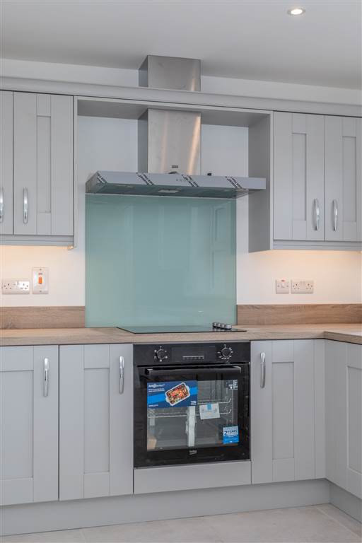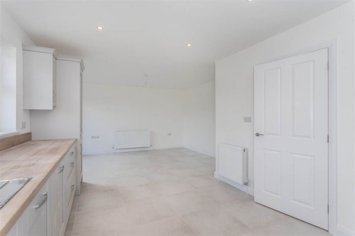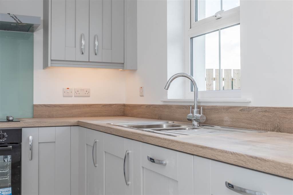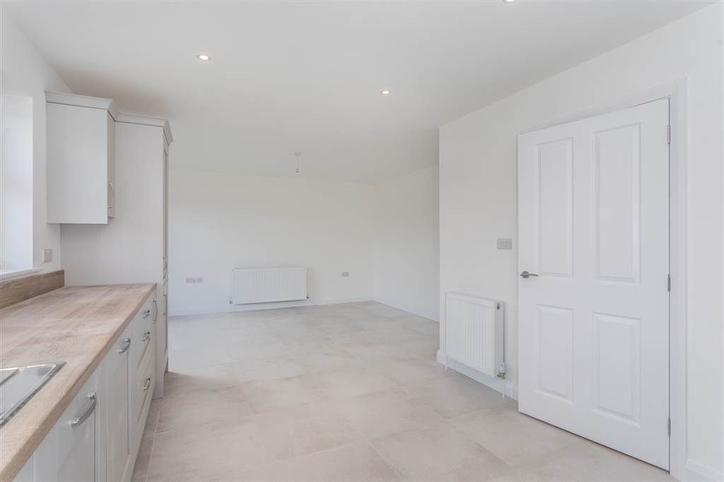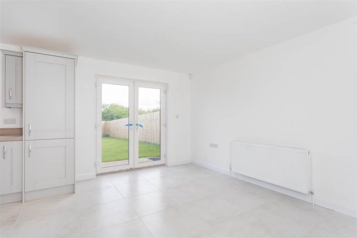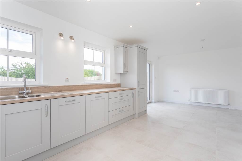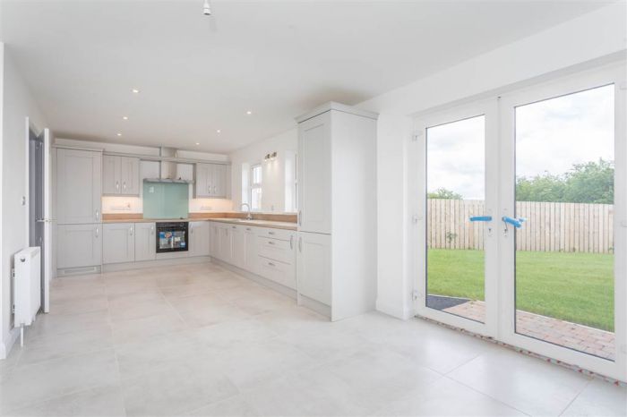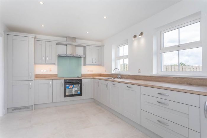 With a range of eye and low level fitted units, 1 1/4 bowl stainless-steel sink unit and drainer with stainless-steel mixer tap. Integrated four ring electric hob and oven with stainless-steel Franke extractor fan over. Integrated fridge-freezer. Integrated dishwasher. Cutlery drawer. Saucepan drawers. Larder cupboard. Spacious area for dining. Under cabinet lighting. Spot lighting to ceiling. Tiled flooring. PVC double door to rear.