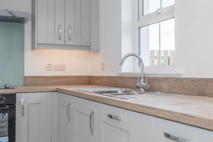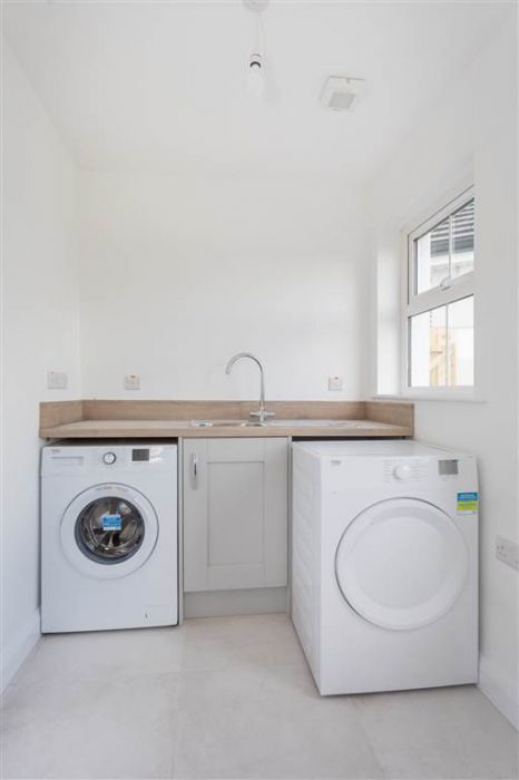 With fitted low level units, stainless-steel sink unit and drainer with stainless-steel mixer tap. Plumbed for washing machine. Space for tumble dryer. Tiled flooring. PVC door to rear.