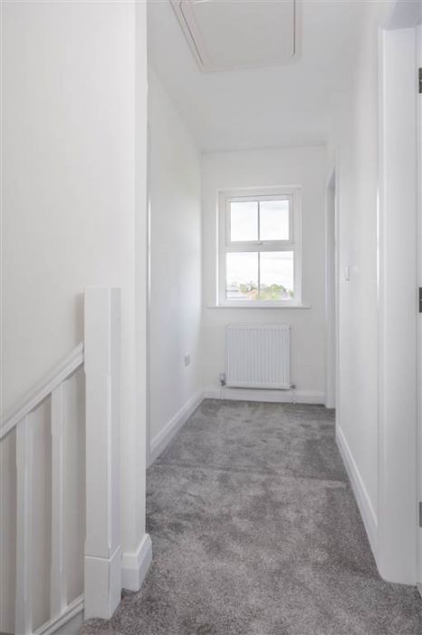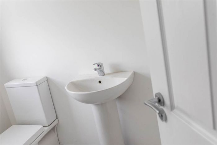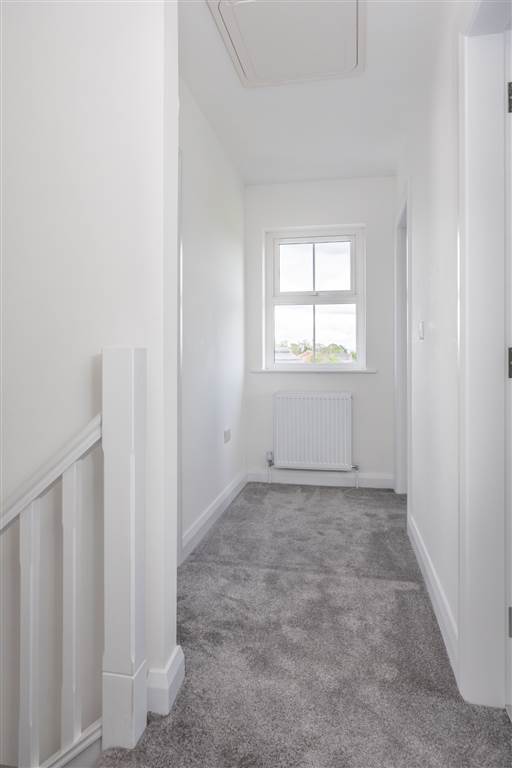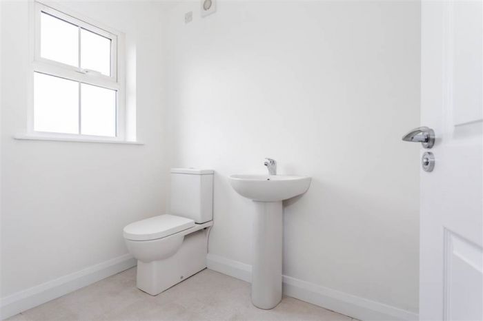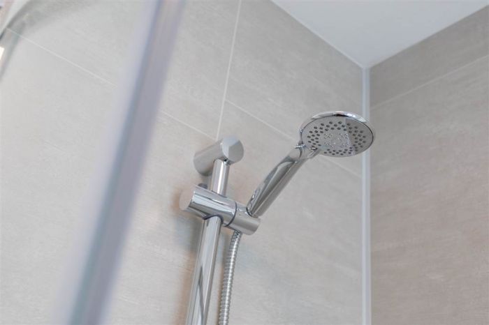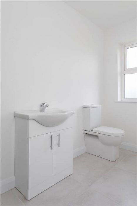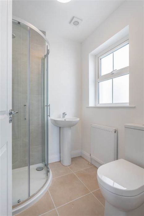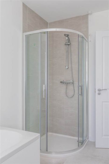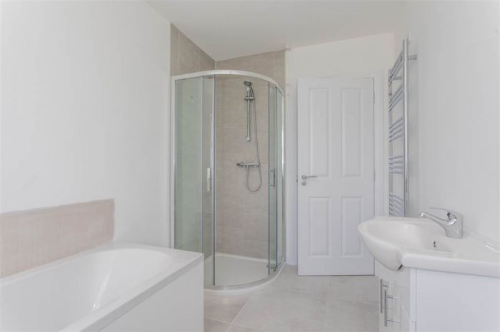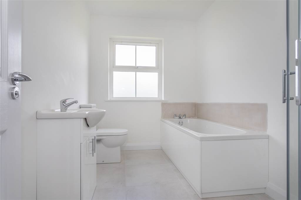 With 4-piece white suite comprising LFWC, WHB with storage unit, panelled bath and Shower to enclosed tiled corner cubicle. Heated towel rail. Tiled flooring.