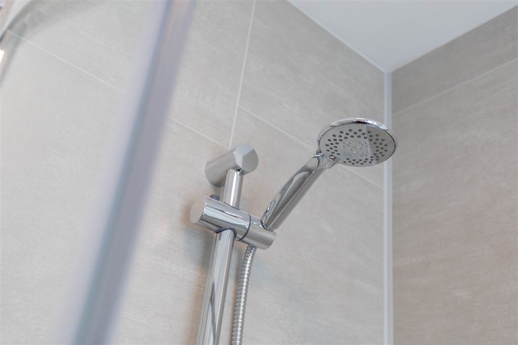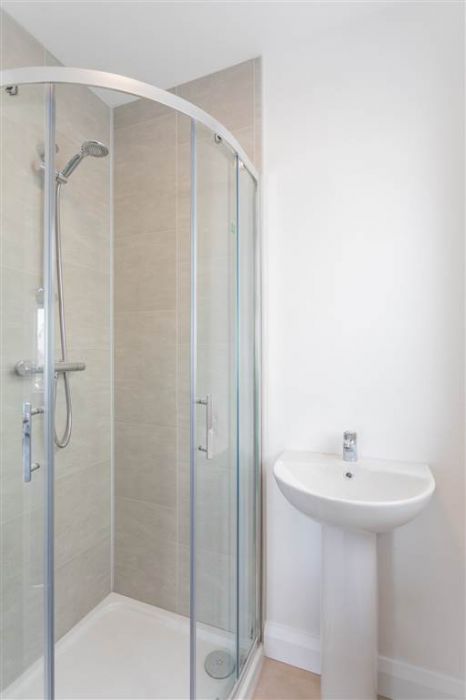 With 3-Piece white suite comprising LFWC, WHB and shower to enclosed tiled corner cubicle. Tiled flooring.