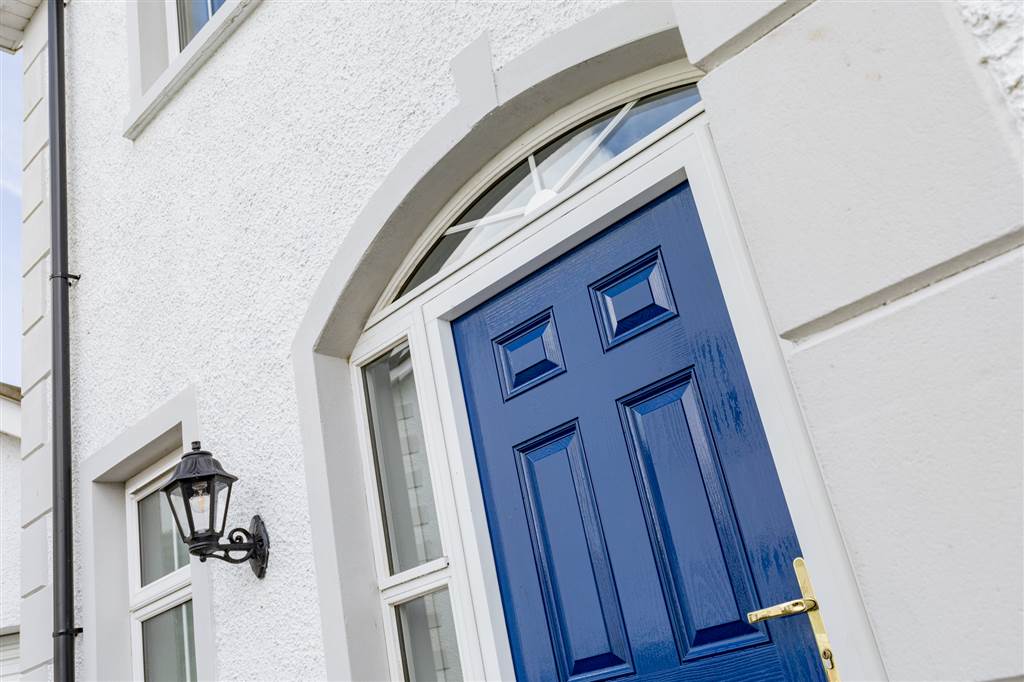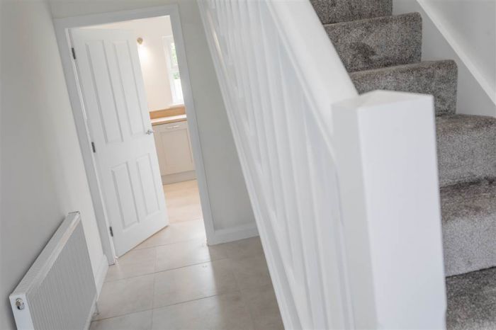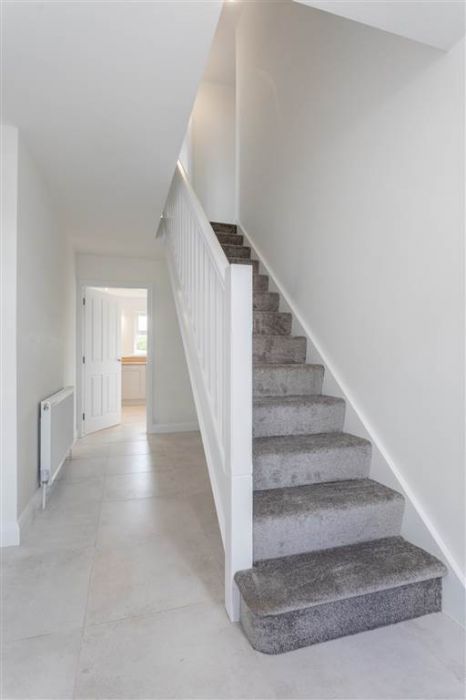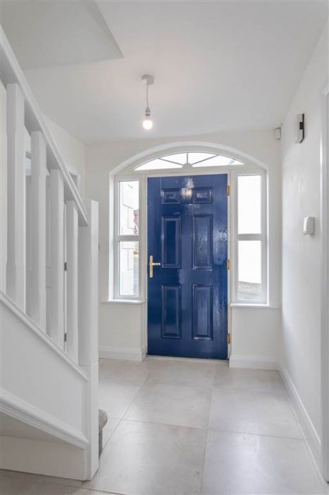 PVC front door with glazed side panes. White balustrade staircase to first floor. Tiled flooring.