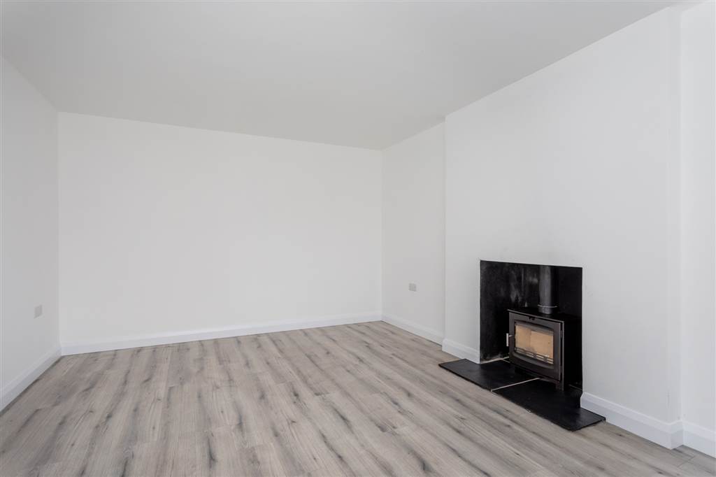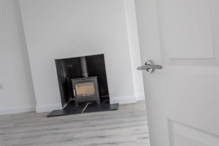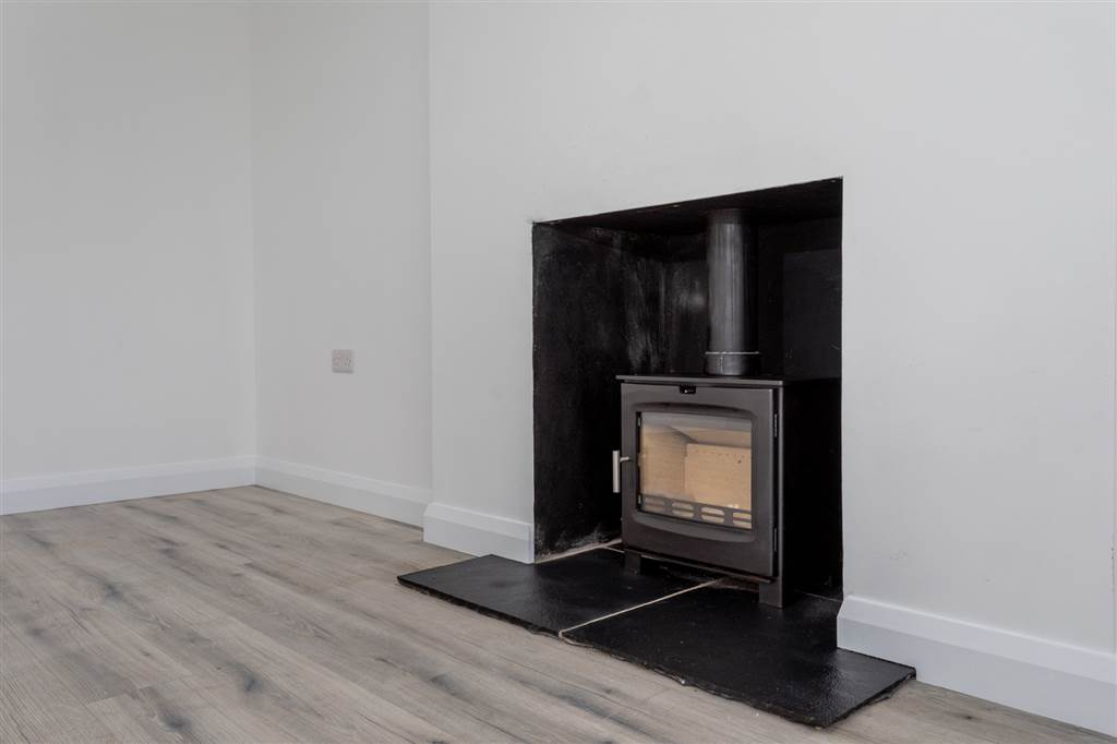 Multi-fuel burning stove to tiled hearth. Laminated wooden flooring.