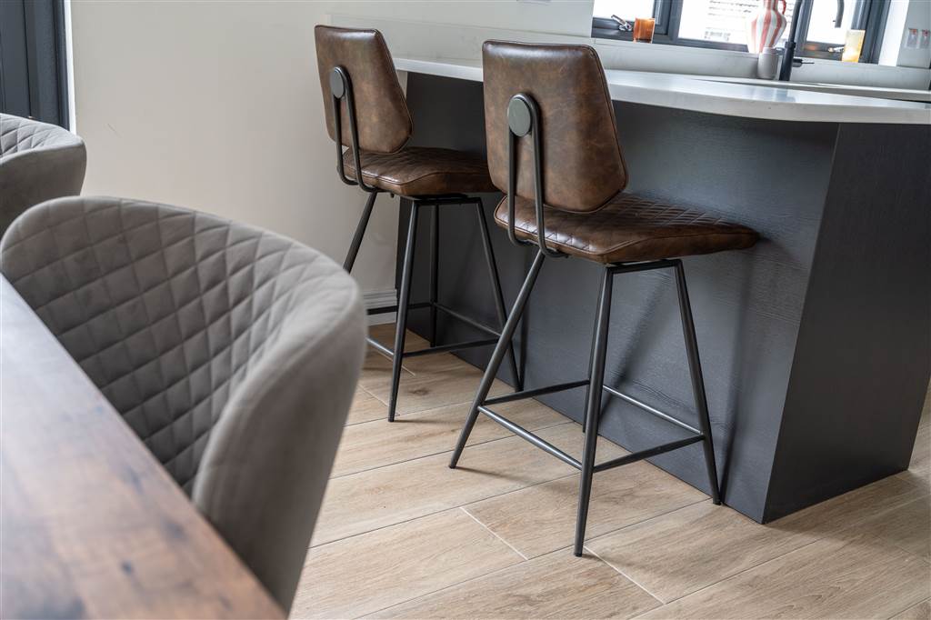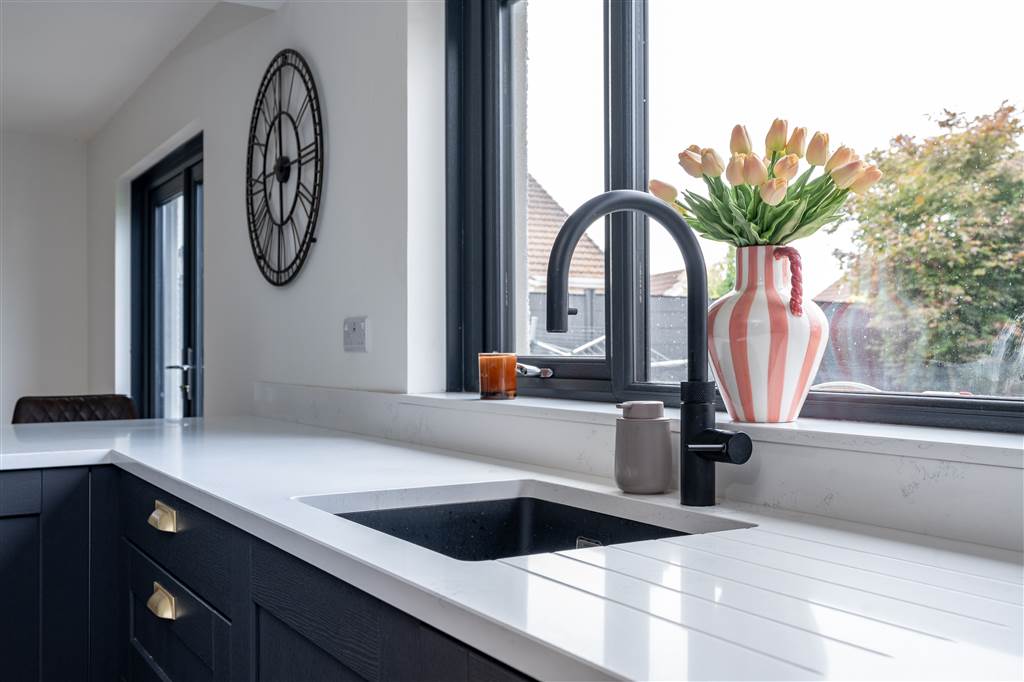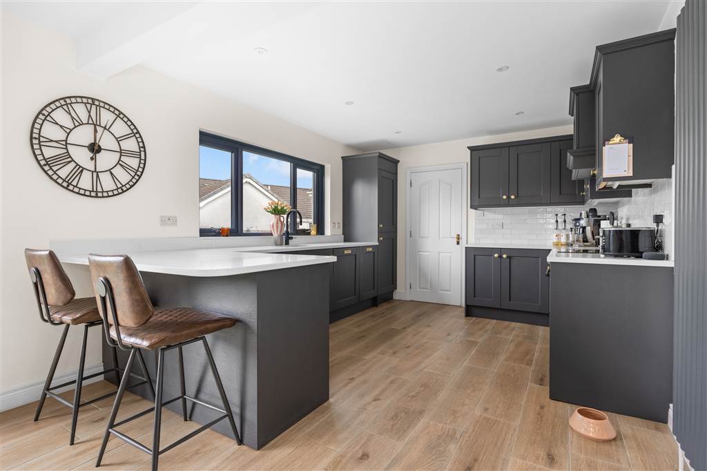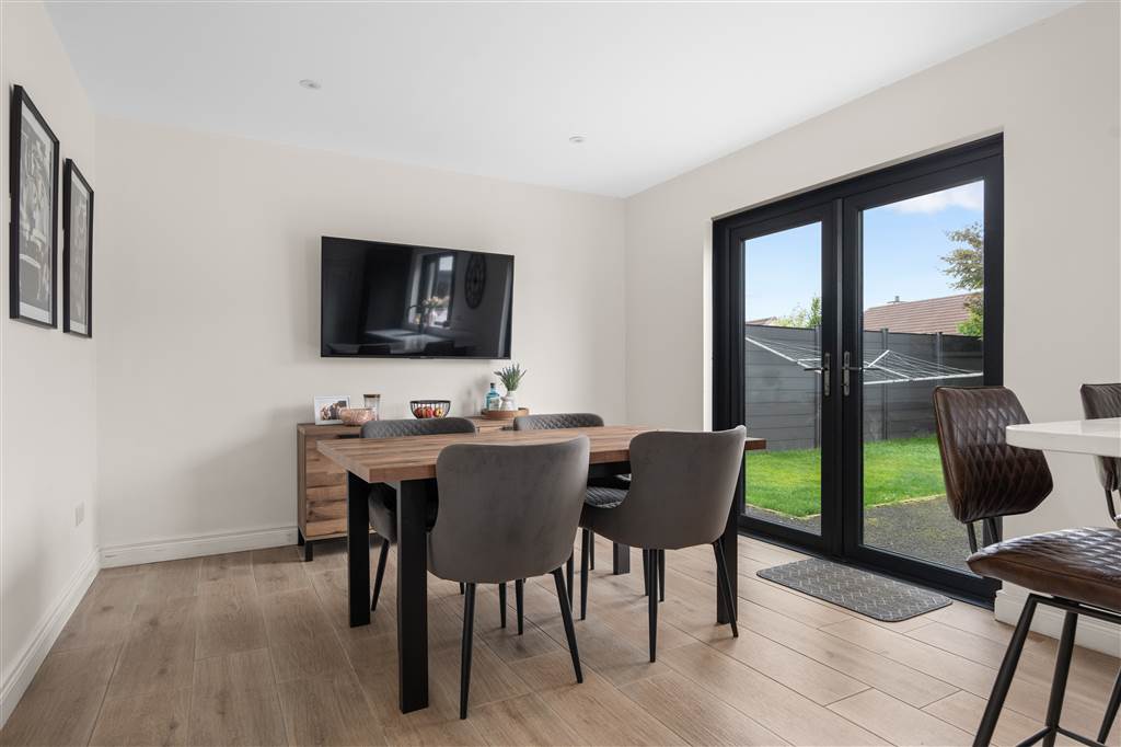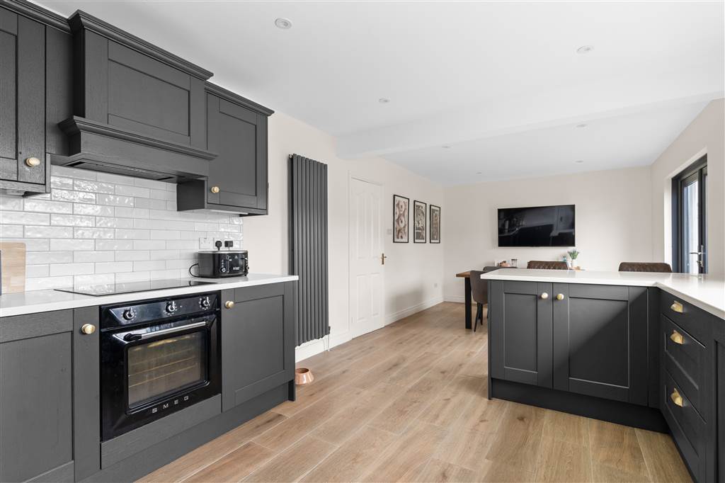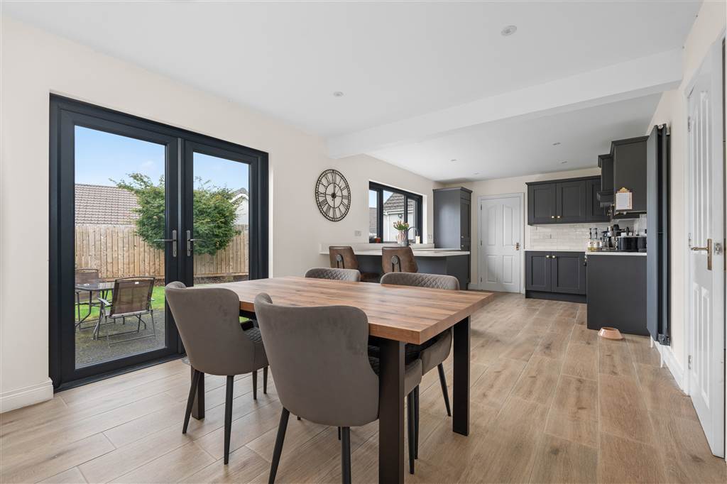 With a range of eye and low-level fitted units with quartz worktop, sink unit with quartz drainer and Quooker boiling water mixer tap. Integrated four ring electric hob and oven with extractor fan over. Integrated fridge-freezer. Integrated dishwasher. Integrated bins. Cutlery drawer. Saucepan drawers. Breakfast bar with seating area. Spacious area for dining. PVC double door to rear. Spot lighting to ceiling. Splash back tiling. Wooden effect tiled flooring.
