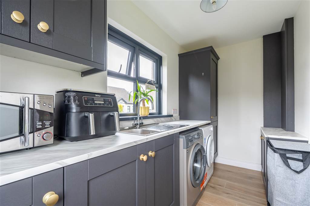 With a range of fitted units, stainless-steel sink unit and drainer with stainless-steel mixer tap. Plumbed for washing machine. Space for tumble dryer. Wooden effect tiled flooring. PVC door to rear.