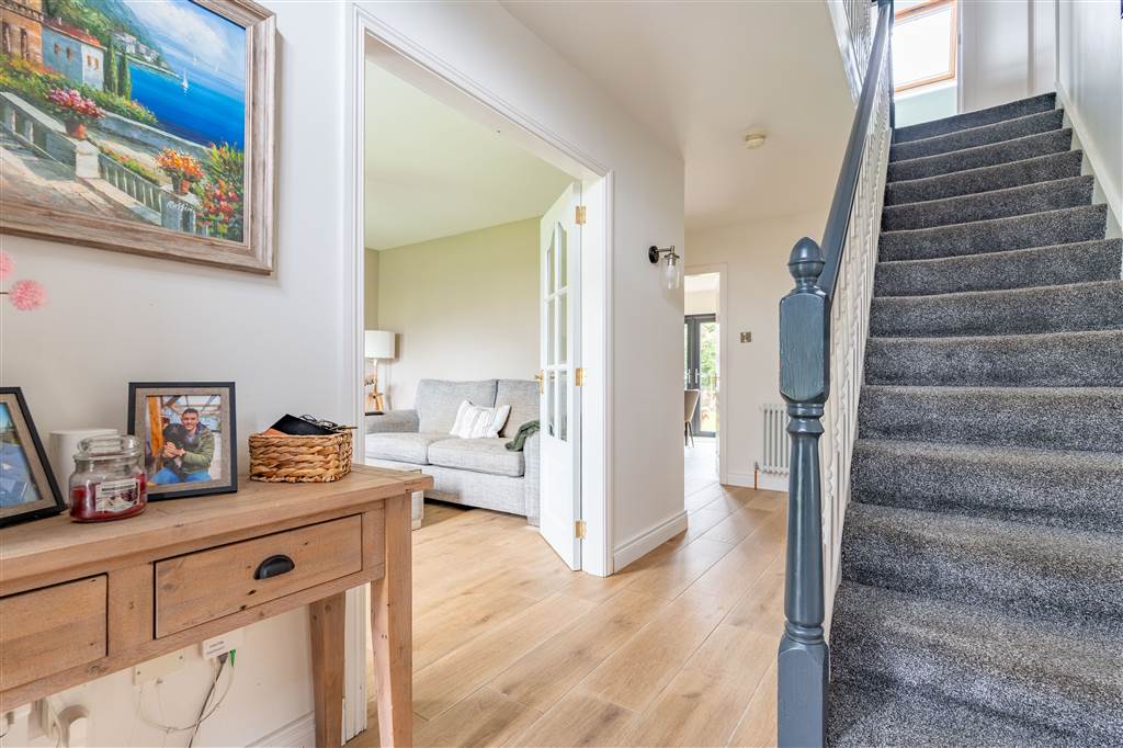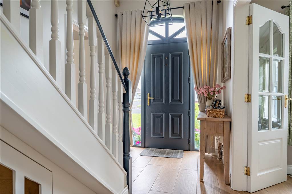 With composite front door with glazed surround. Balustrade staircase to first floor. Under stair storage cupboard. Wall light. Wooden effect tiled flooring.