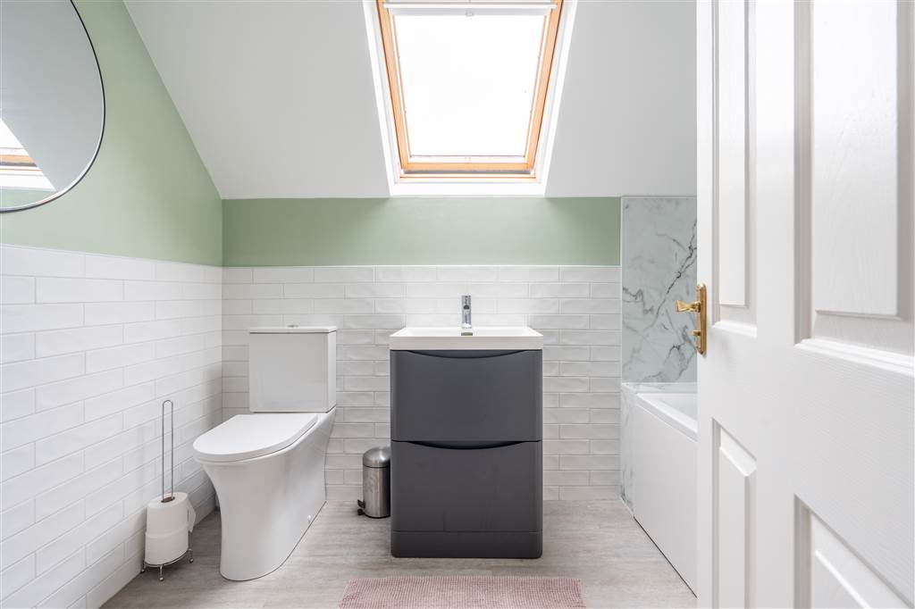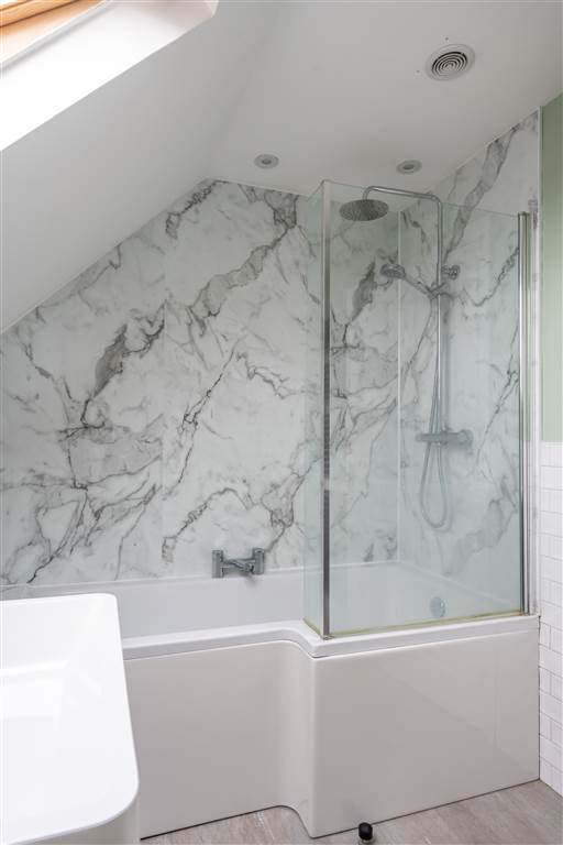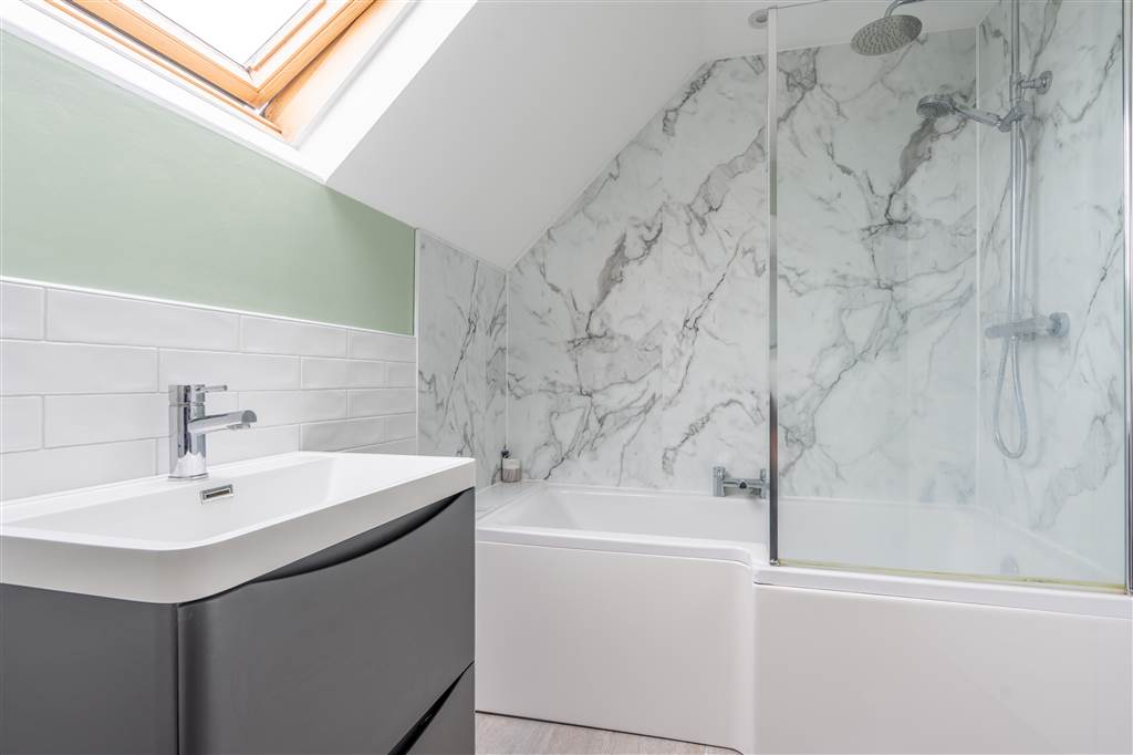 With 3-piece white suite comprising LFWC, WHB with built-in vanity unit and P-shaped bath with shower over. Velux window. Spot lighting to ceiling. Splash back tiling.