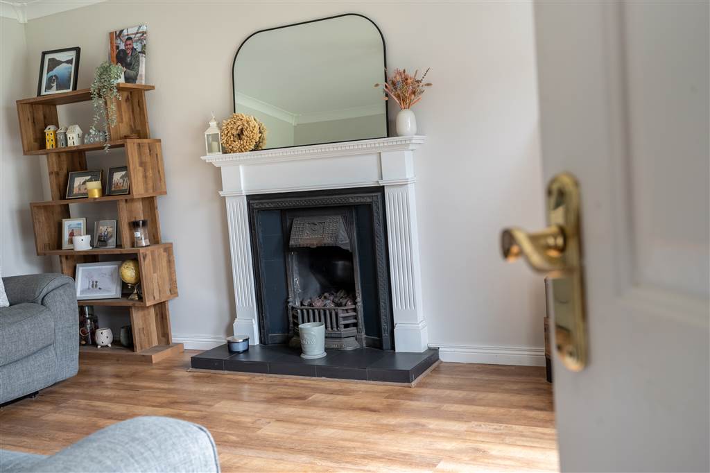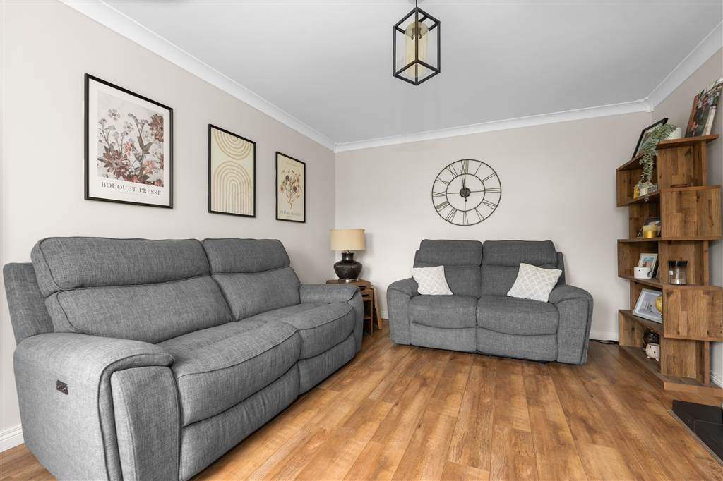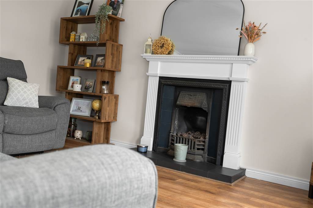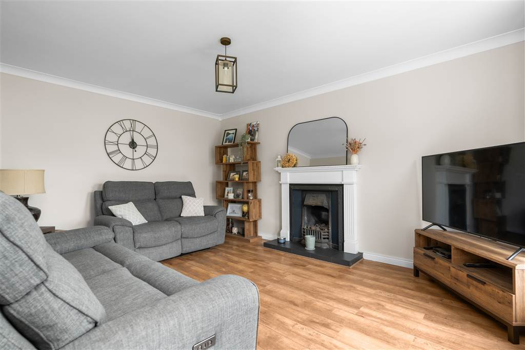 With cast-iron fireplace to tiled hearth, wooden surround and mantle. Coving to ceiling. Laminated wooden flooring.