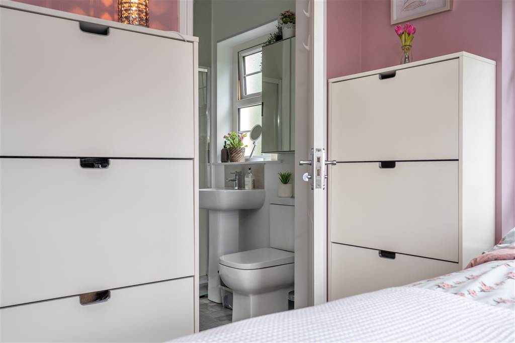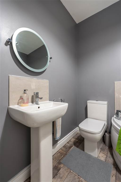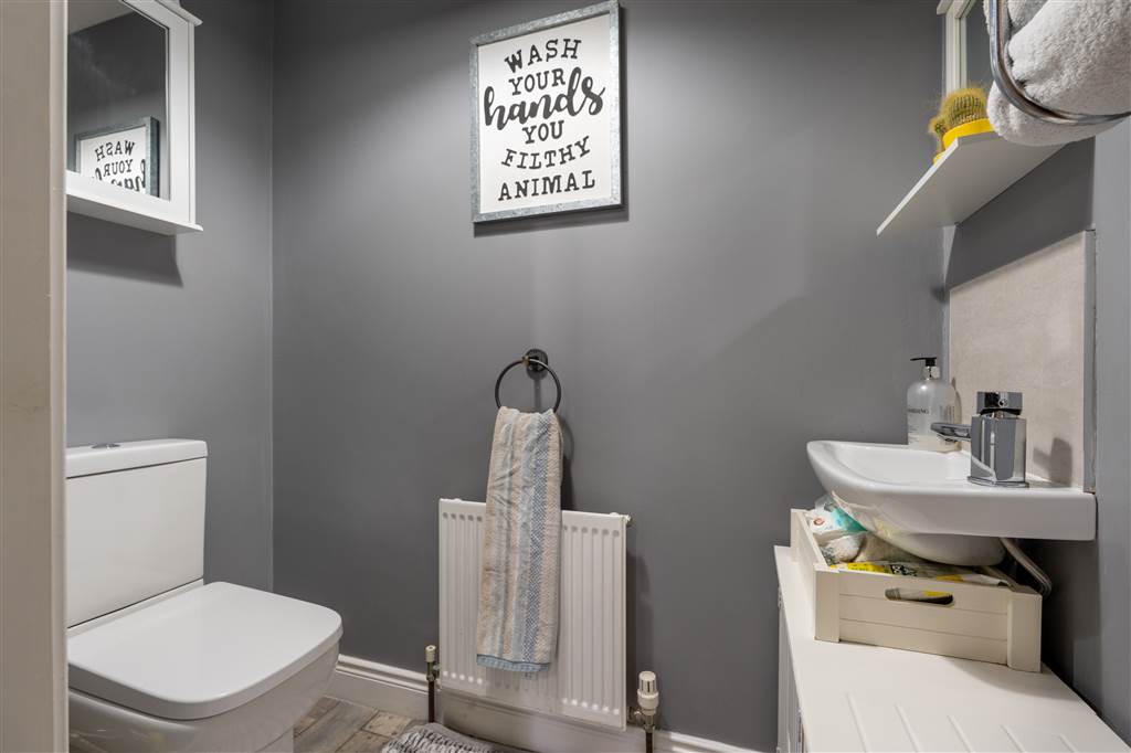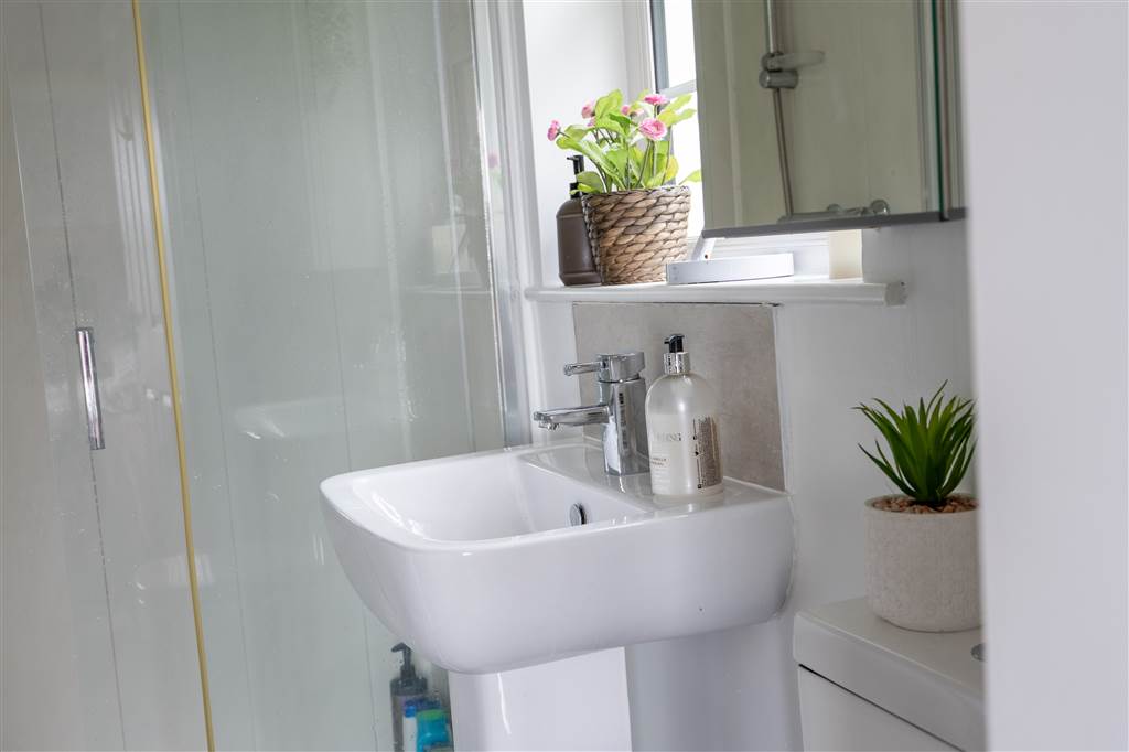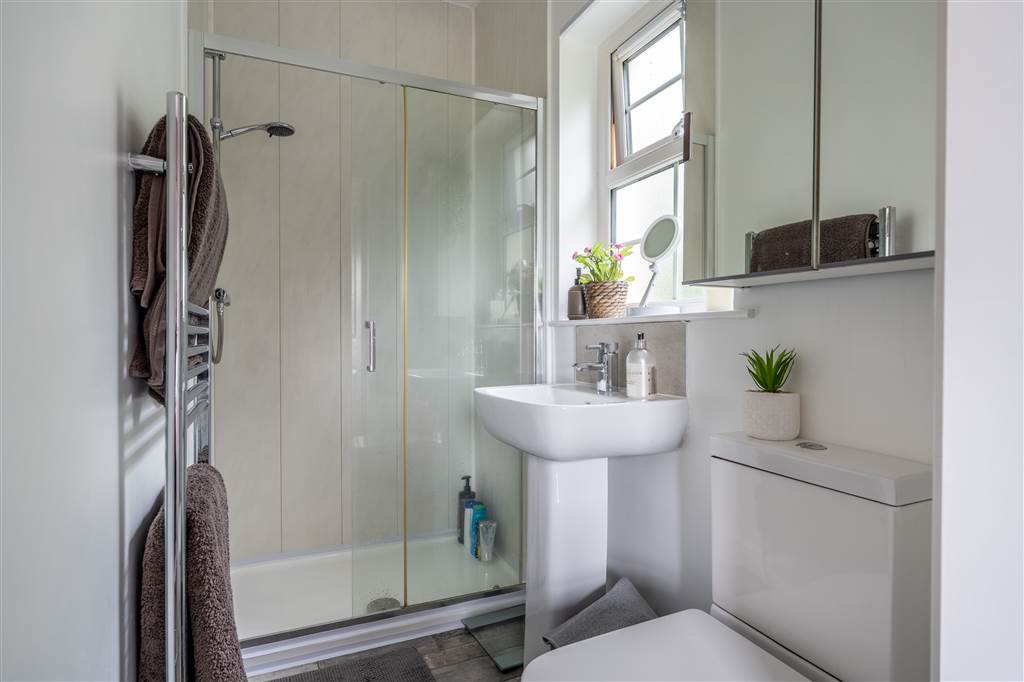 With 3-piece white suite comprising LFWC, WHB and shower to enclosed cubicle. Heated towel rail. Splash back tiling.