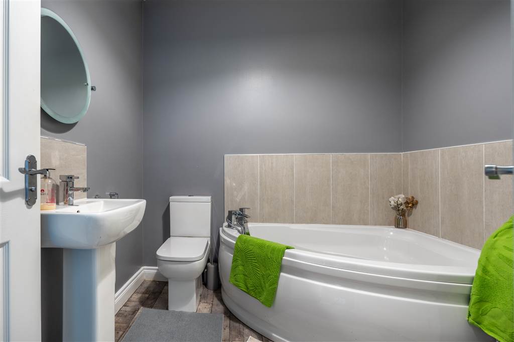 With 3-piece white suite comprising LFWC, WHB and corner bath. Hot-press with shelved storage. Splash back tiling.