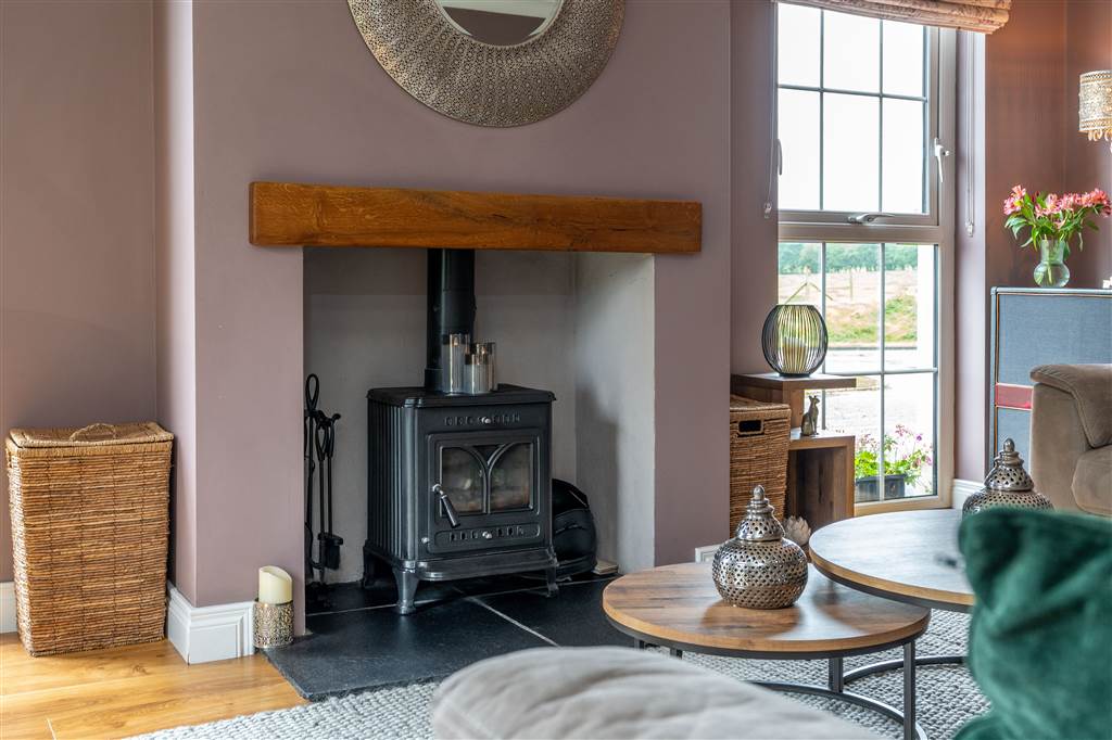 With multi-fuel burning stove to slate hearth and railway sleeper style mantle. Coving to ceiling. Wooden flooring.