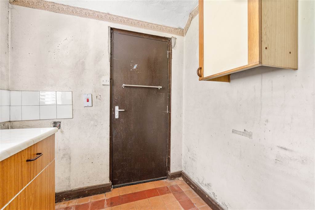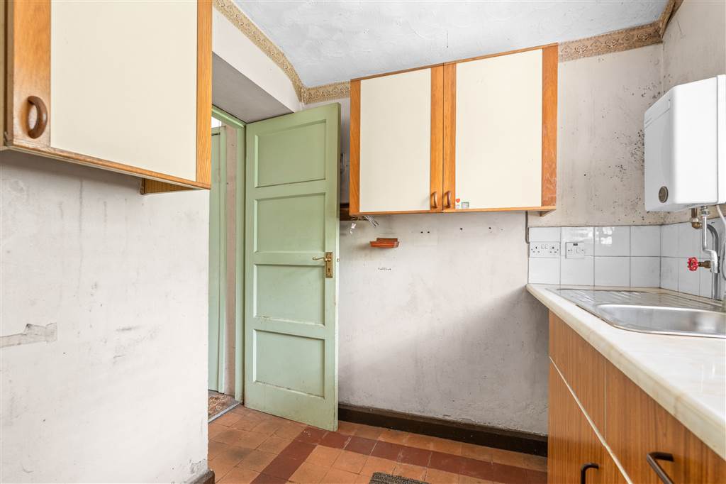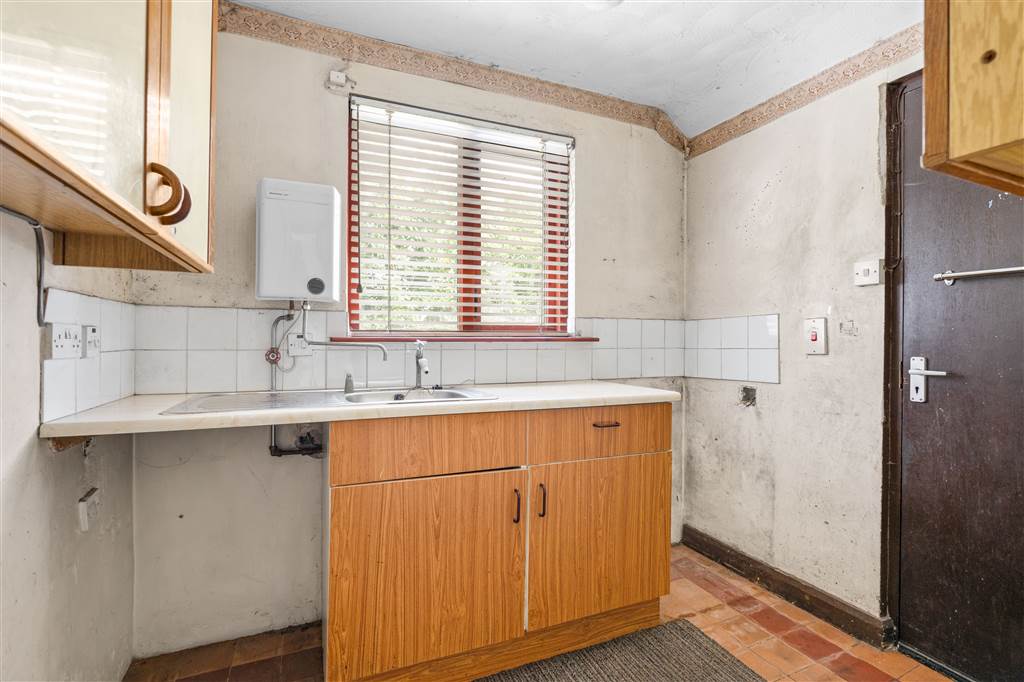 With eye and low level fitted units, stainless-steel sink unit and drainer with stainless-steel tap. Redring wall-mounted over sink boiling water tank with tap. Space for four ring electric hob and oven. Space for fridge-freezer. Cutlery drawer. Splash back tiling. Tiled flooring. Hardwood door to rear.