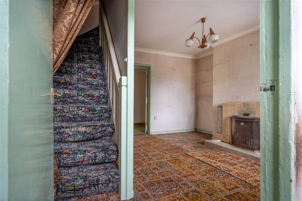 With staircase to first floor. Fireplace to tiled hearth, surround and mantle. Under stair storage cupboard. Coving to ceiling.