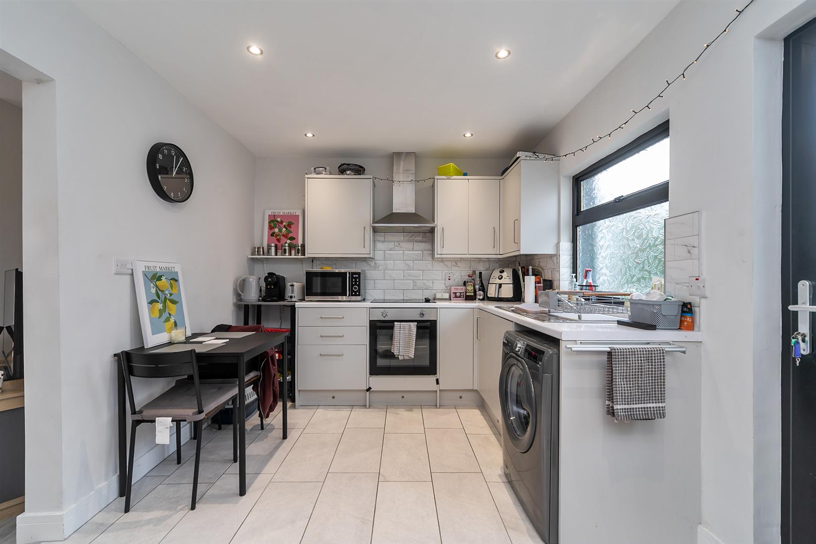 Range of high and low level units, single drainer stainless steel sink unit, stainless steel oven and ceramic 4 ring hob, plumbing for washing machine, part tiled walls, fully tiled flooring, recessed spotlighting.