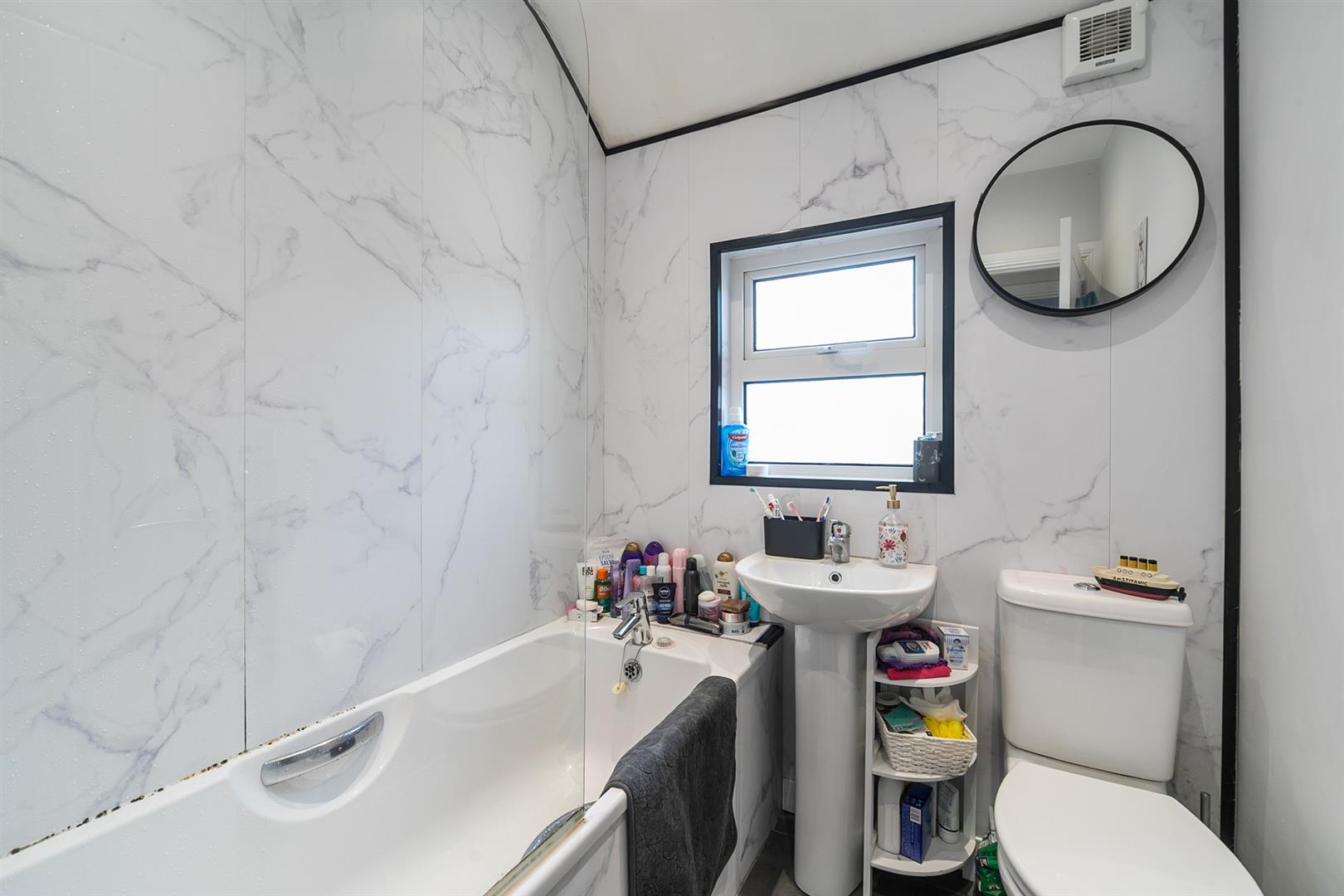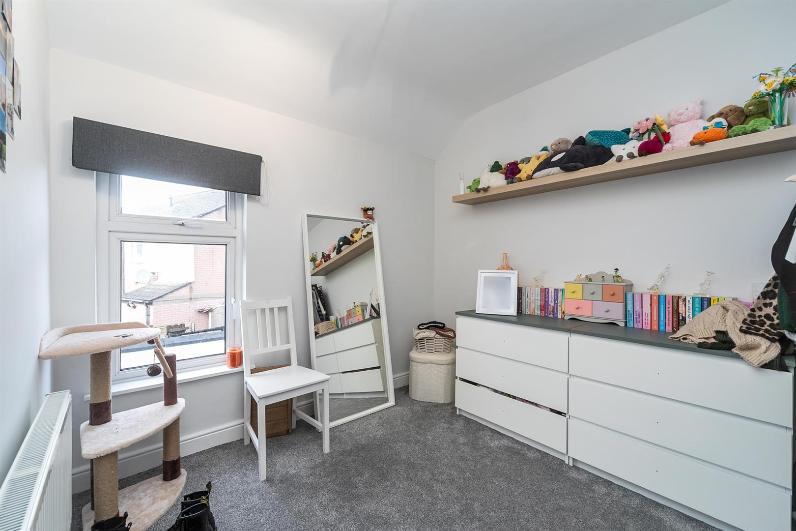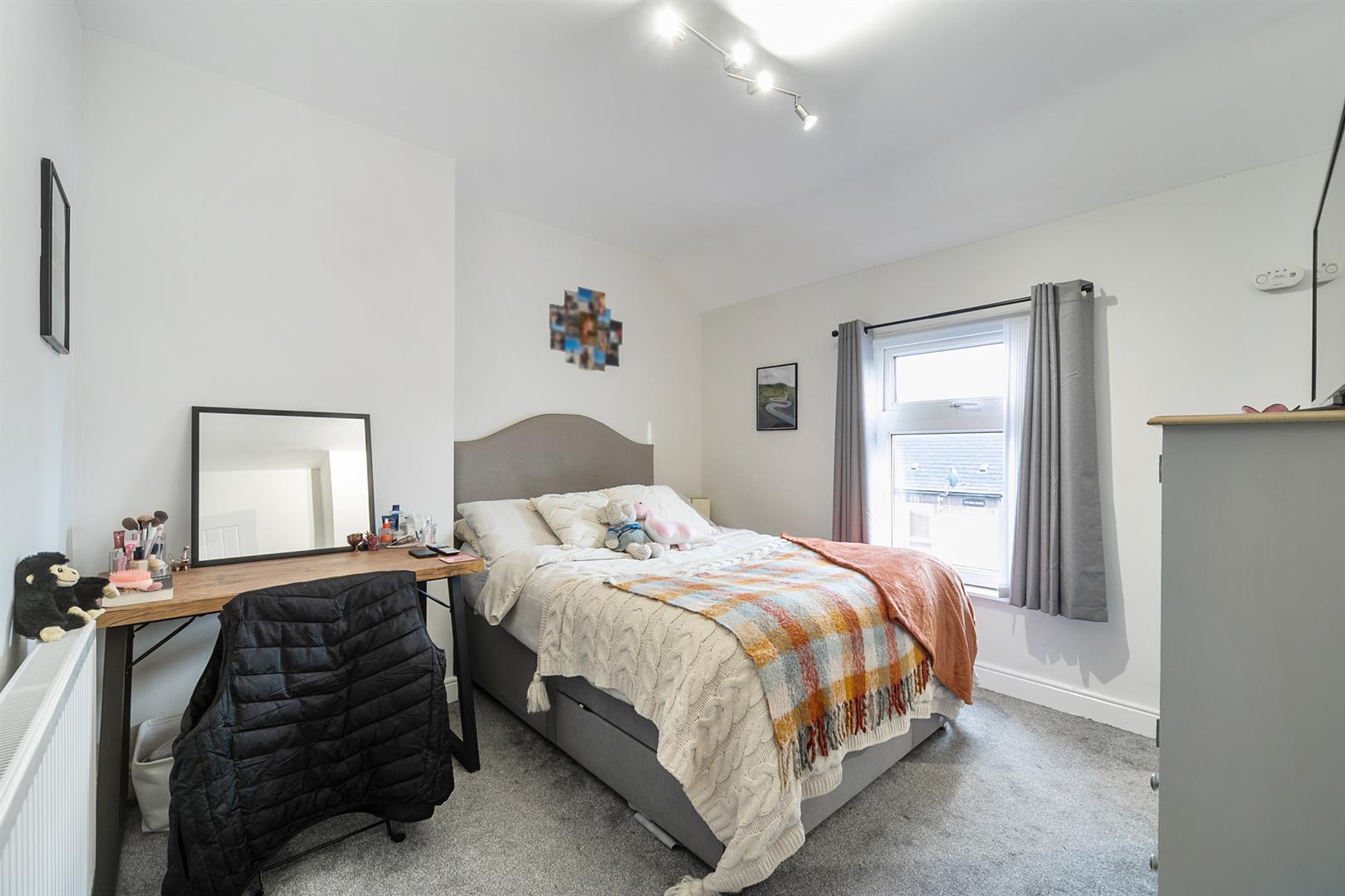 To the first floor, the property offers two well-proportioned bedrooms, with the principal bedroom featuring a built-in wardrobe. The accommodation is completed by a bathroom fitted with a white suite comprising a panelled bath with shower over, pedestal wash hand basin, and low-flush WC. Externally, the property benefits from an enclosed rear yard with a decked area.