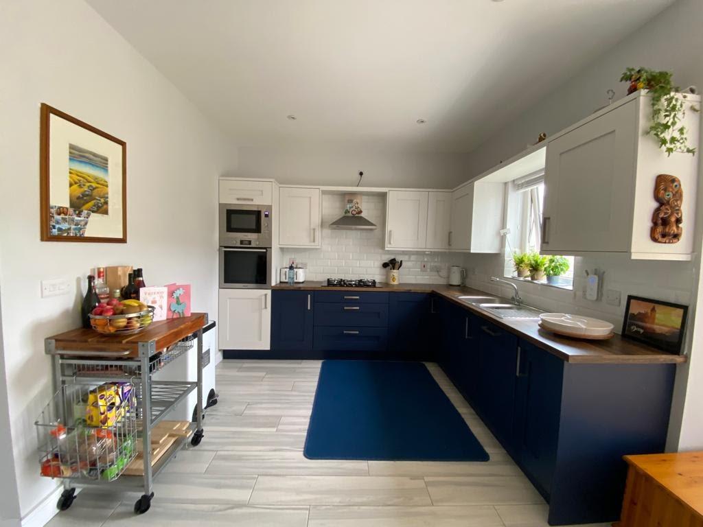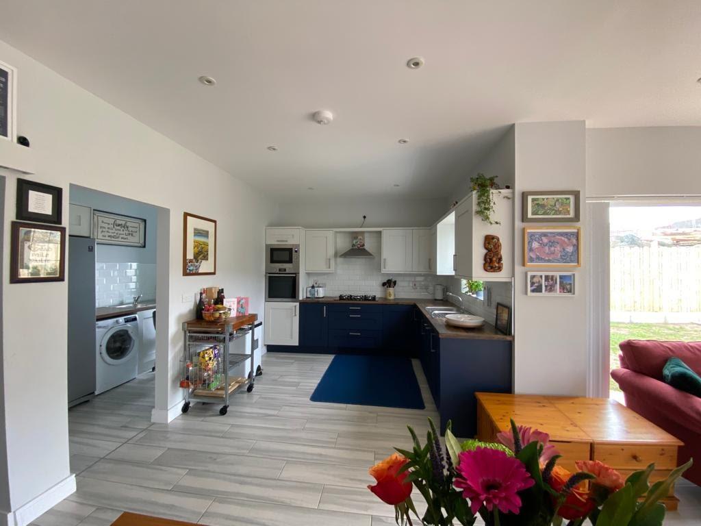 Having range of units, sink unit, plumbed for washing machine, space for tumble dryer, recessed lighting, part tiling around units, tiled floor.
