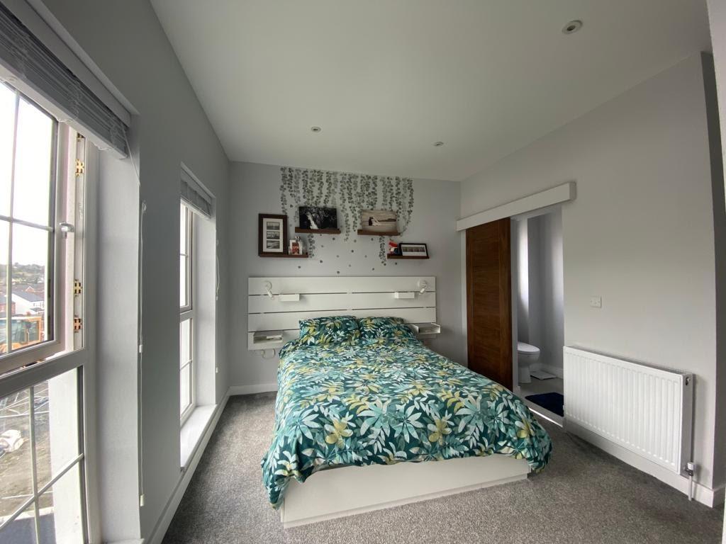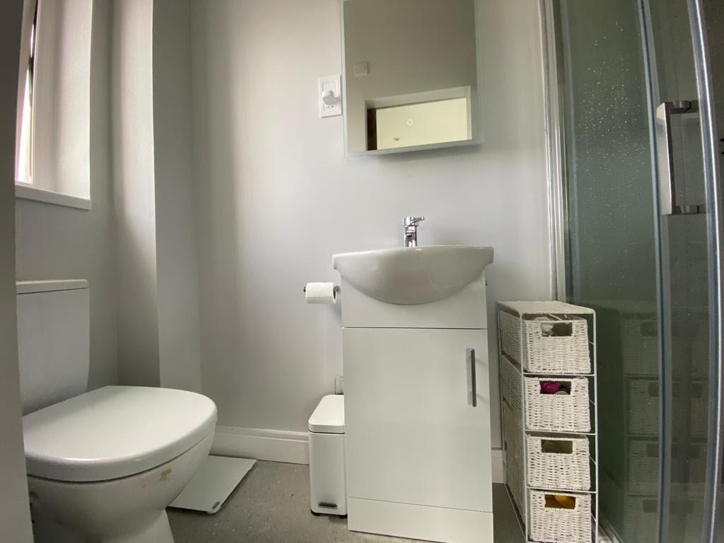 Ensuite comprising fully tiled walk in shower, wash hand basin set in vanity unit, wc, tiled floor