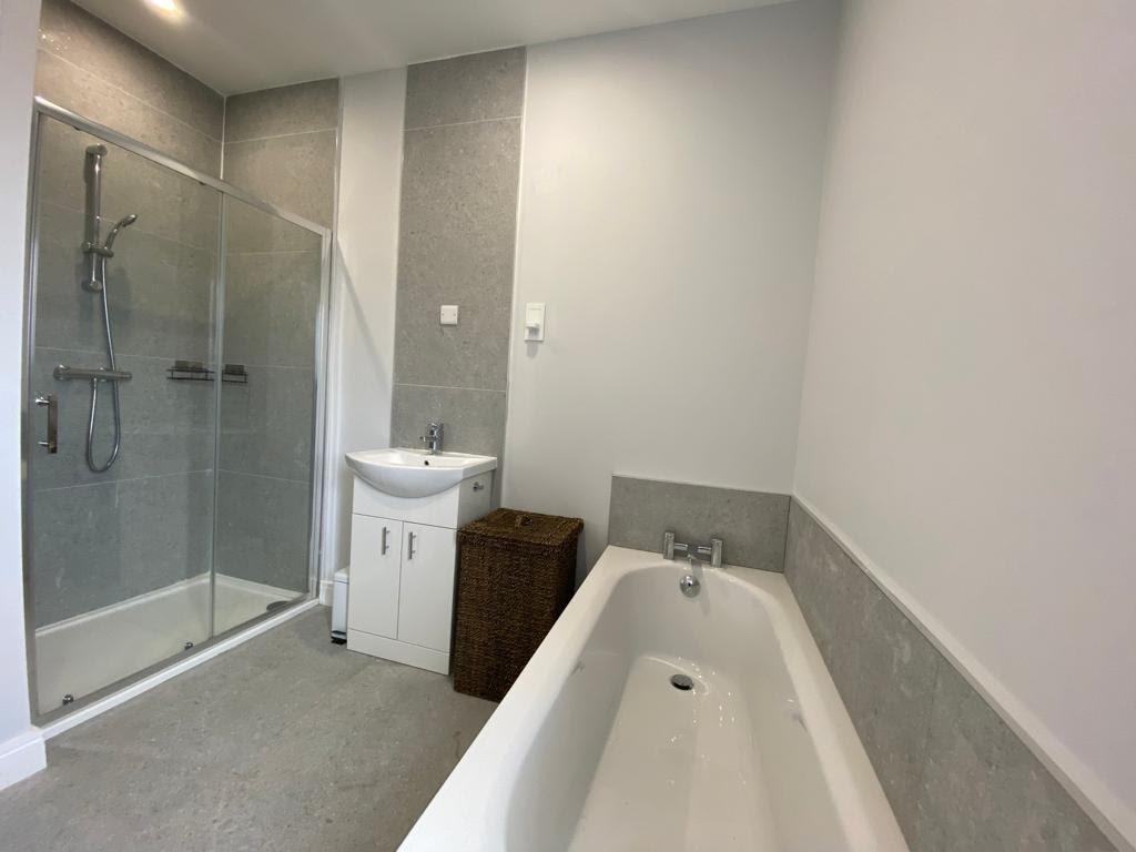 Comprising bath, wash hand basin set in vanity unit, fully tiled walk in shower, wc, tiled floor.