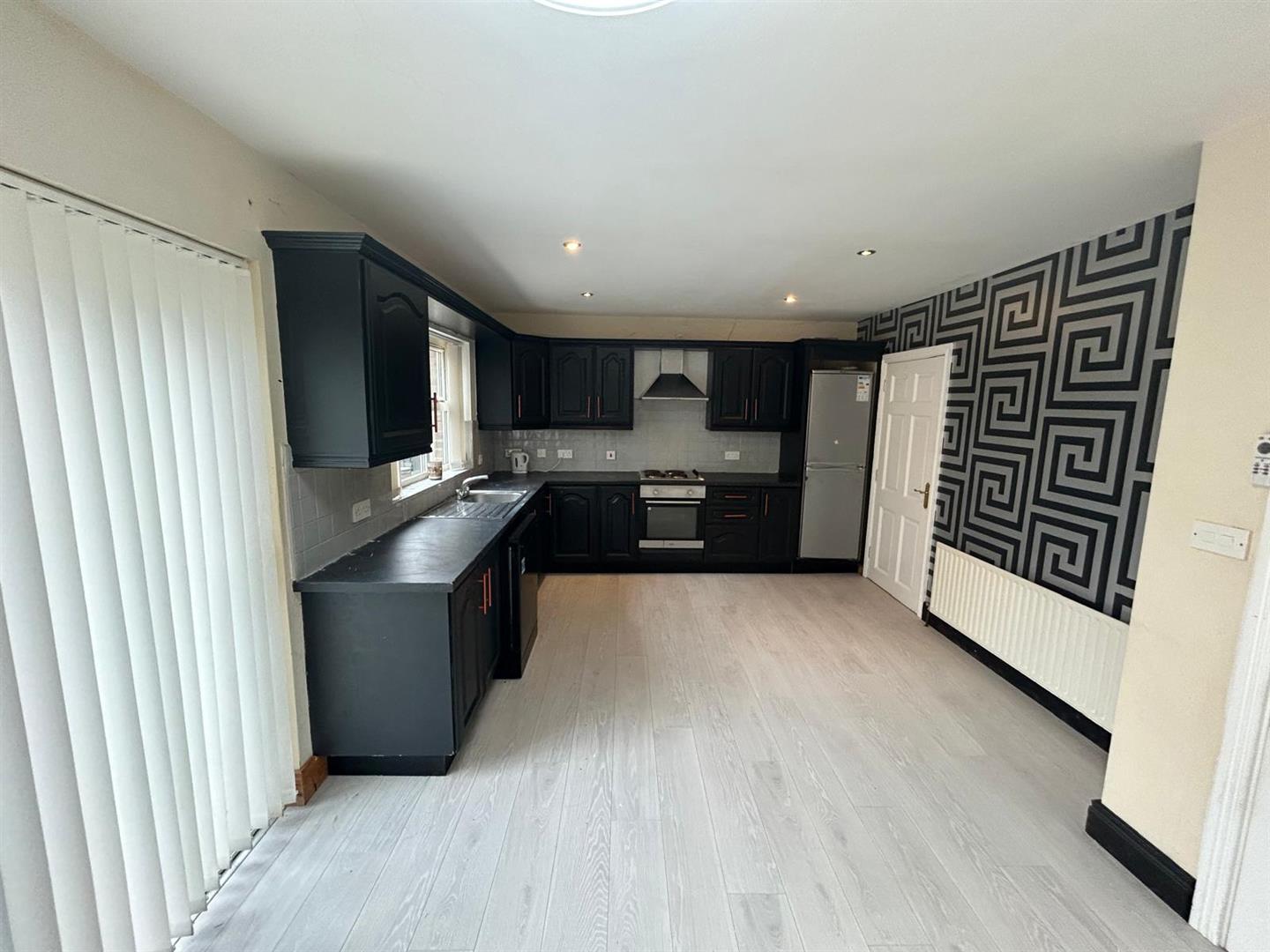 Having eye and low level units, tiling between units, single drainer stainless steel sink unit with mixer taps, integrated hob and underoven, stainless steel extractor hood, space for fridge / freezer and dishwasher, recessed lighting, patio doors leading to rear, understairs storage, laminated wooden floor.