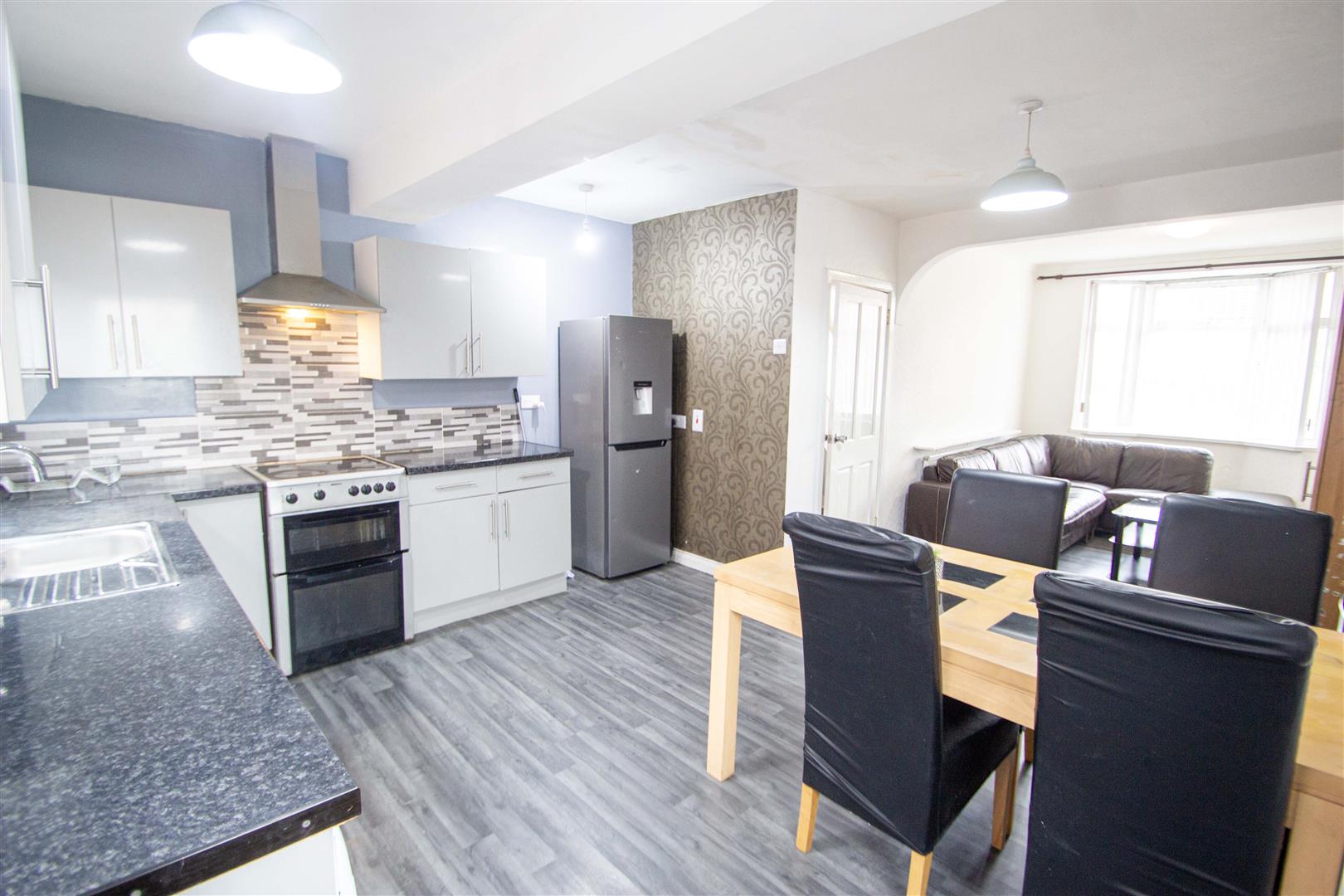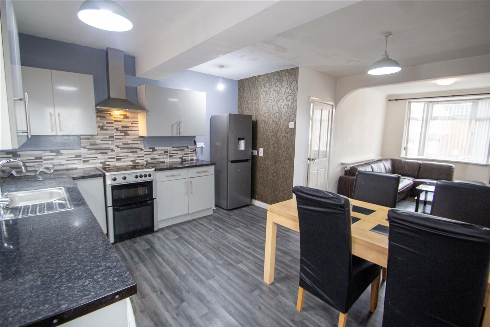 Extended lounge / dining area open to a fitted kitchen.