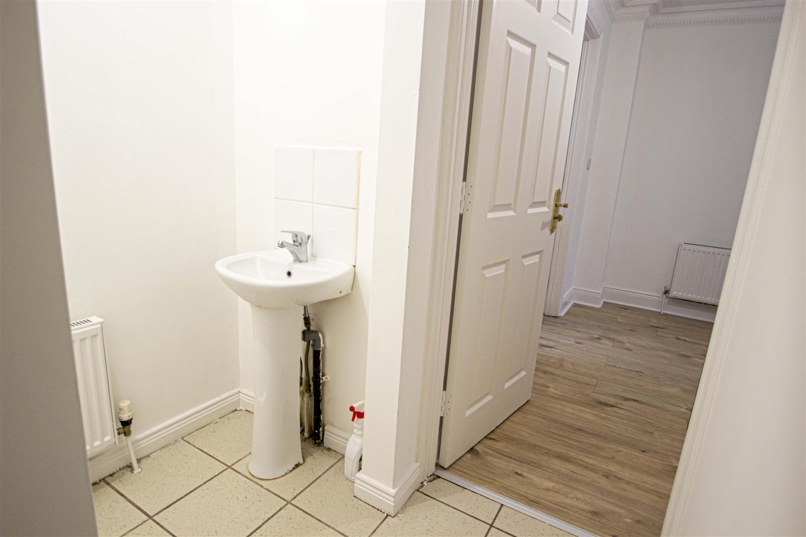 Low flush w.c, pedestal wash hand basin, extractor fan, cloaks space.