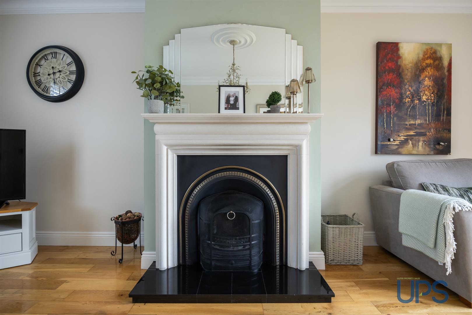 Solid wood flooring, decorative centre rose and cornicing, and an attractive fireplace with open fire, complemented by UPVC double-glazed double doors opening to the garden.