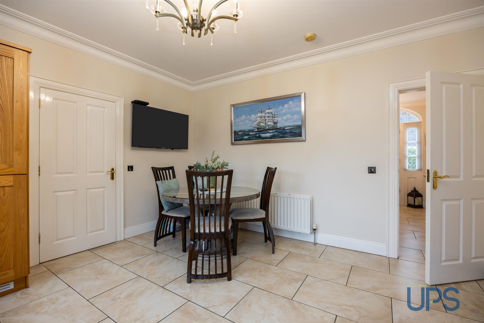 Centre rose, ornate cornicing, and useful understairs storage.