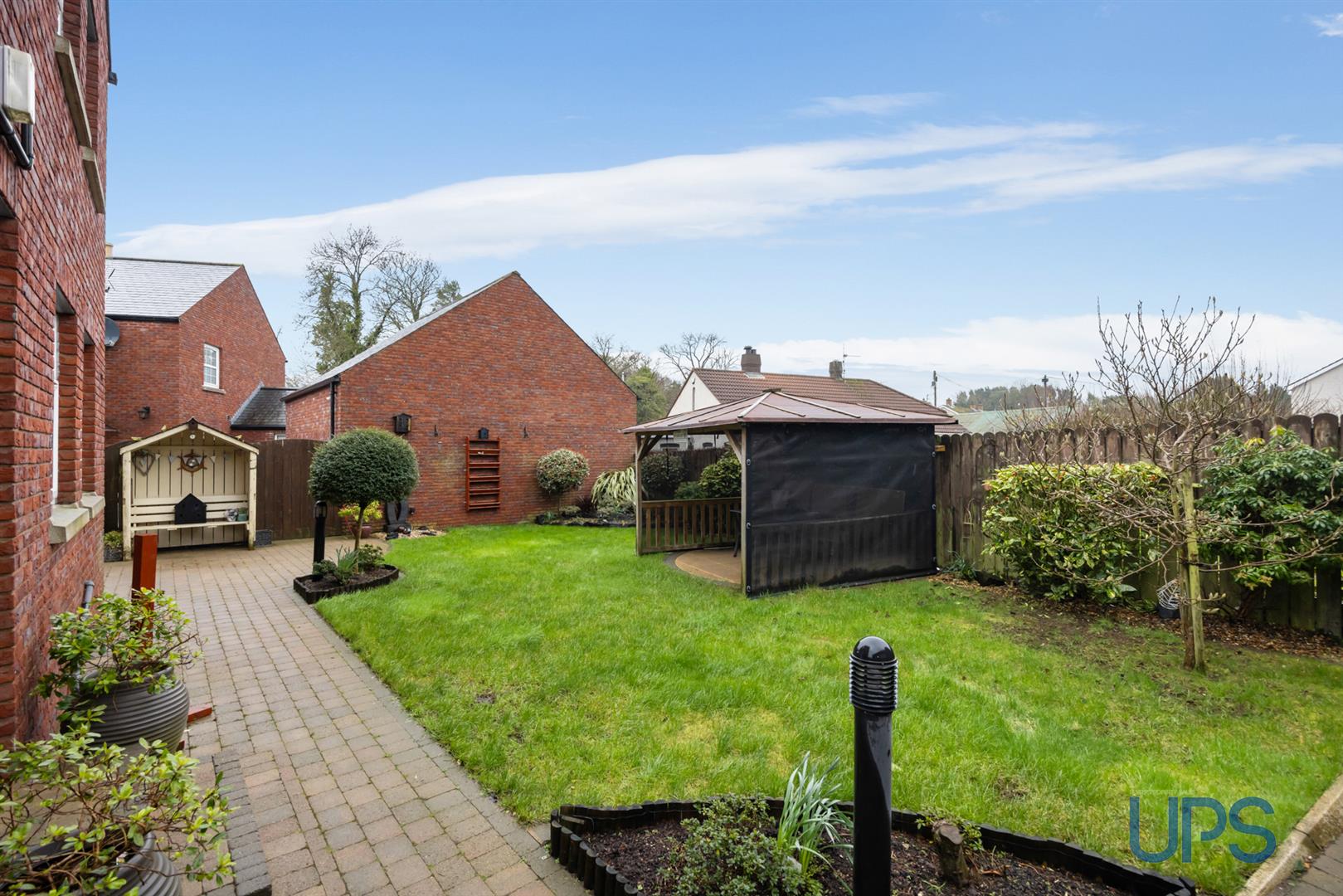 Well-maintained, privately enclosed large rear garden with an additional brick-paved patio.