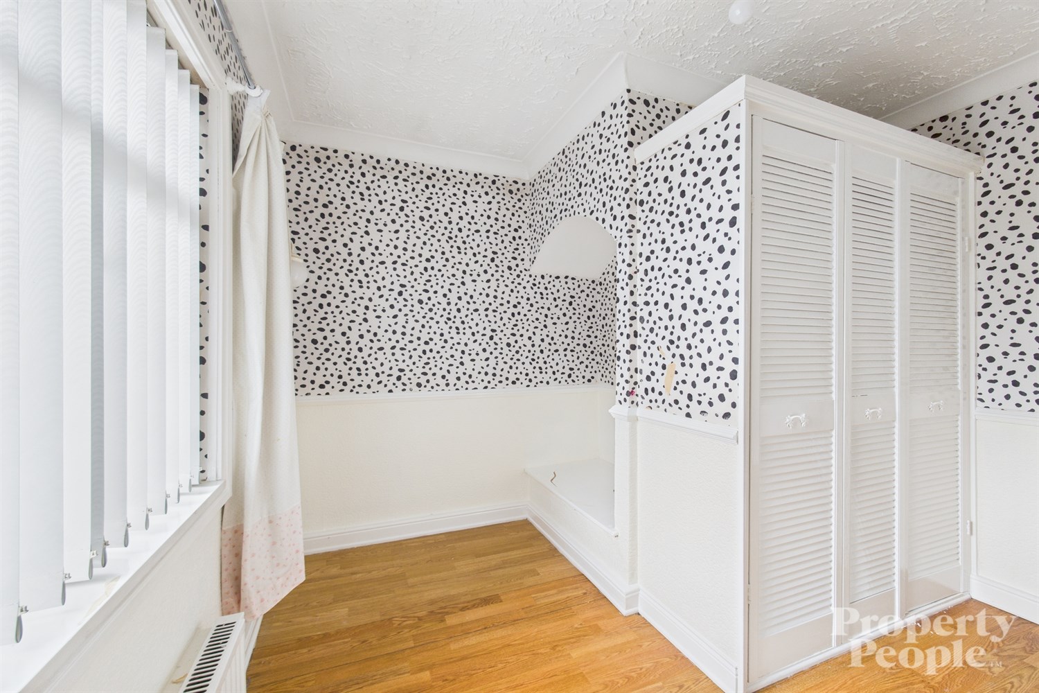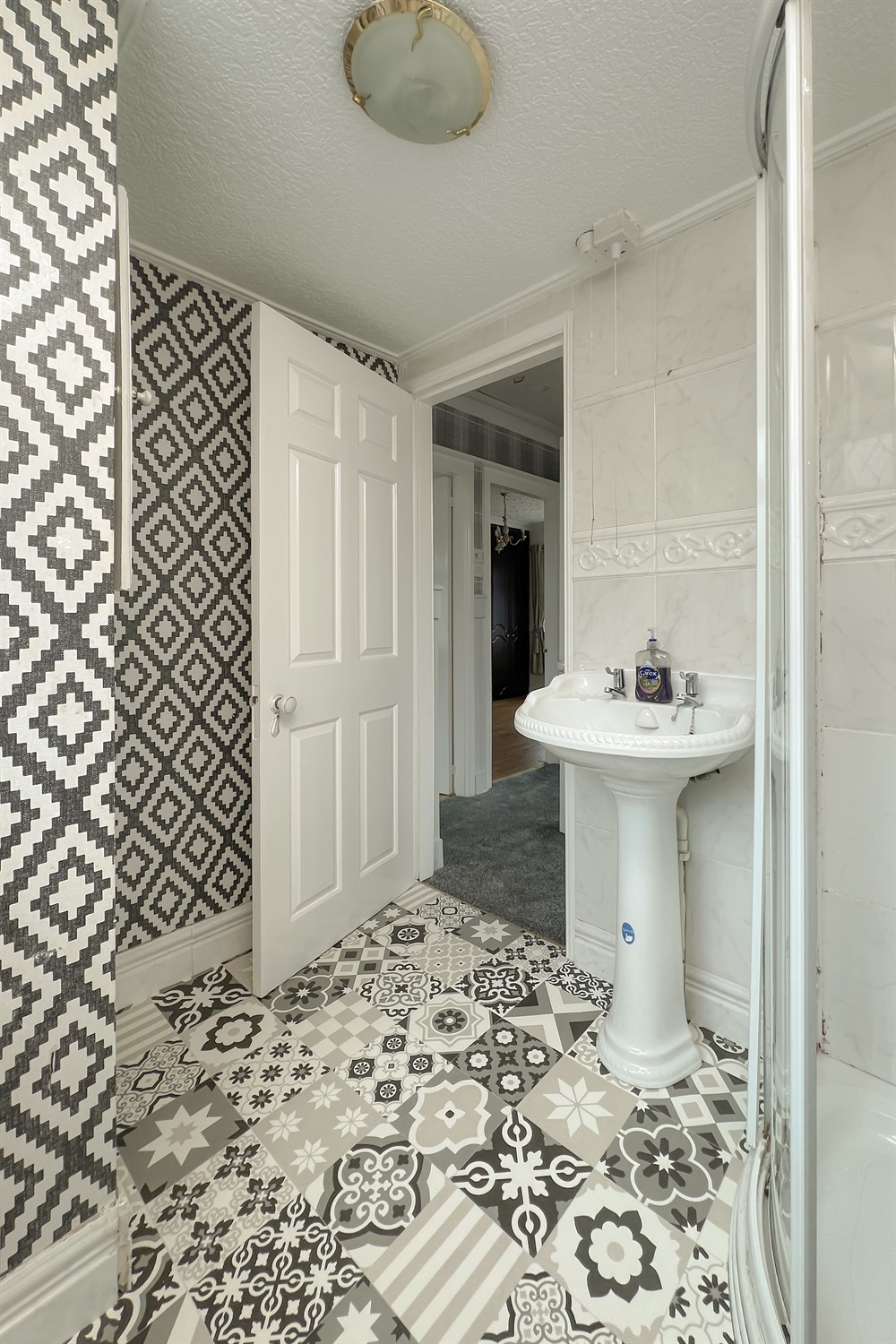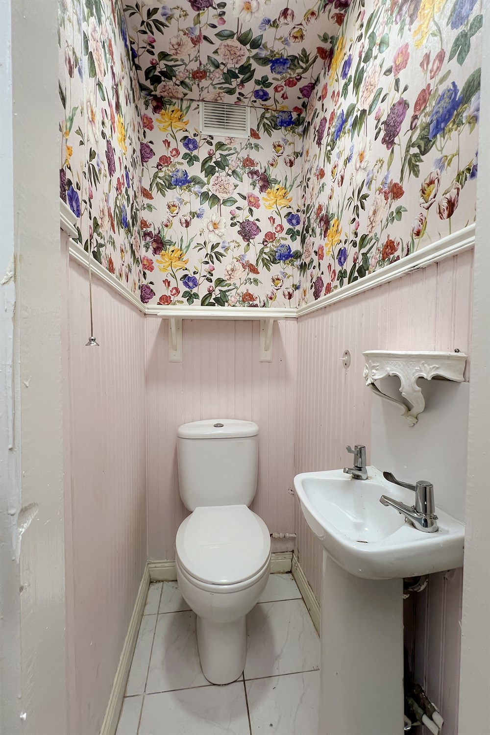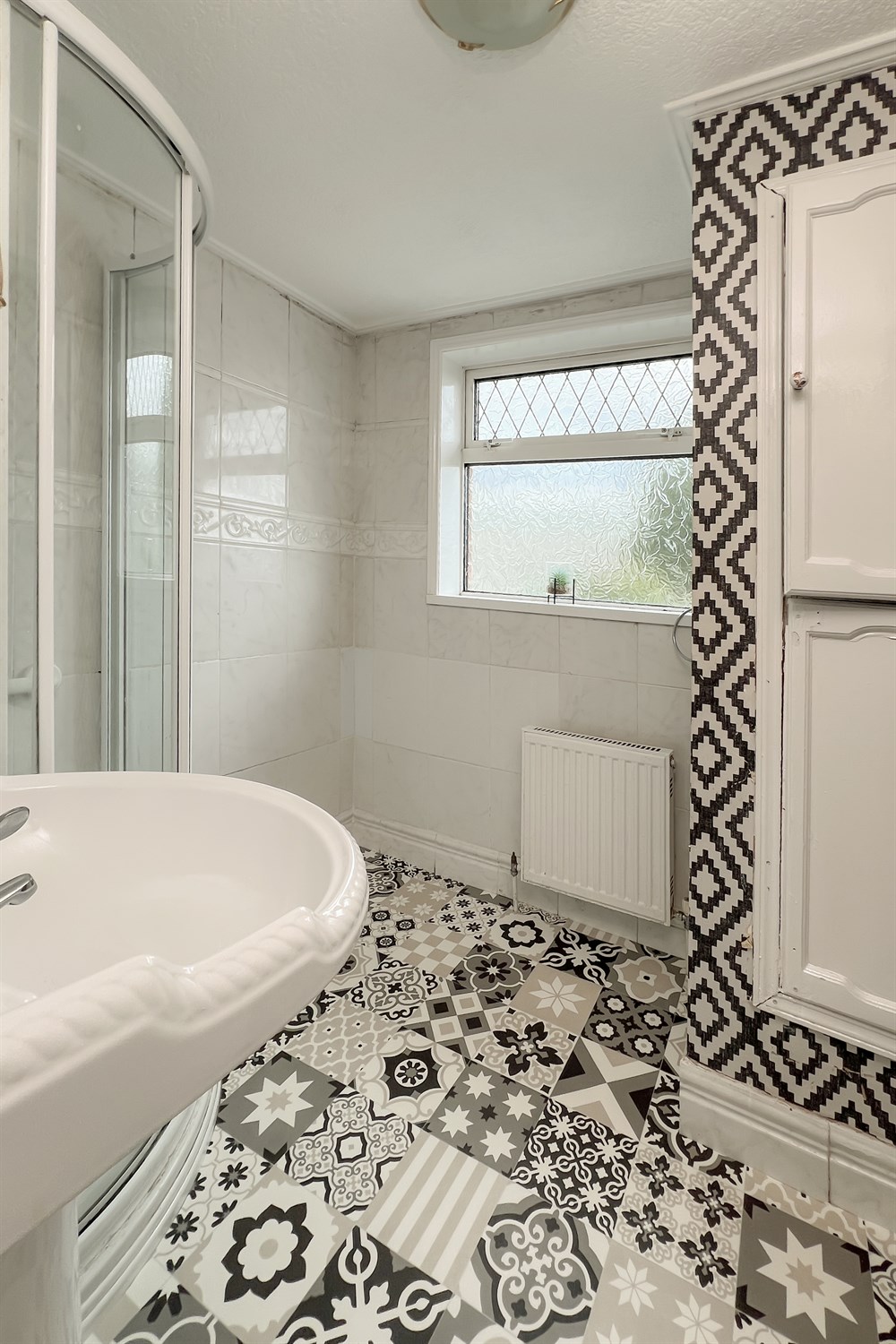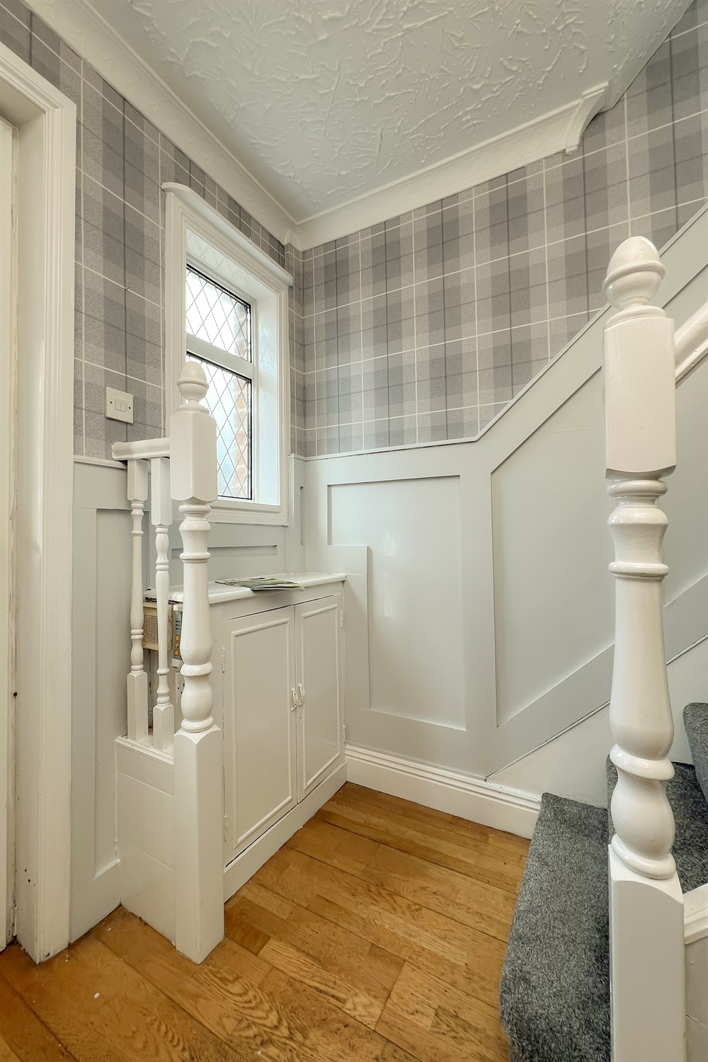 Comprising three bedrooms, two bathrooms, and two reception rooms, this property offers ample space for comfortable living. The spacious interior features a bright living area, a hallway adorned with a stunning stained glass window, and a convenient downstairs panelled toilet.