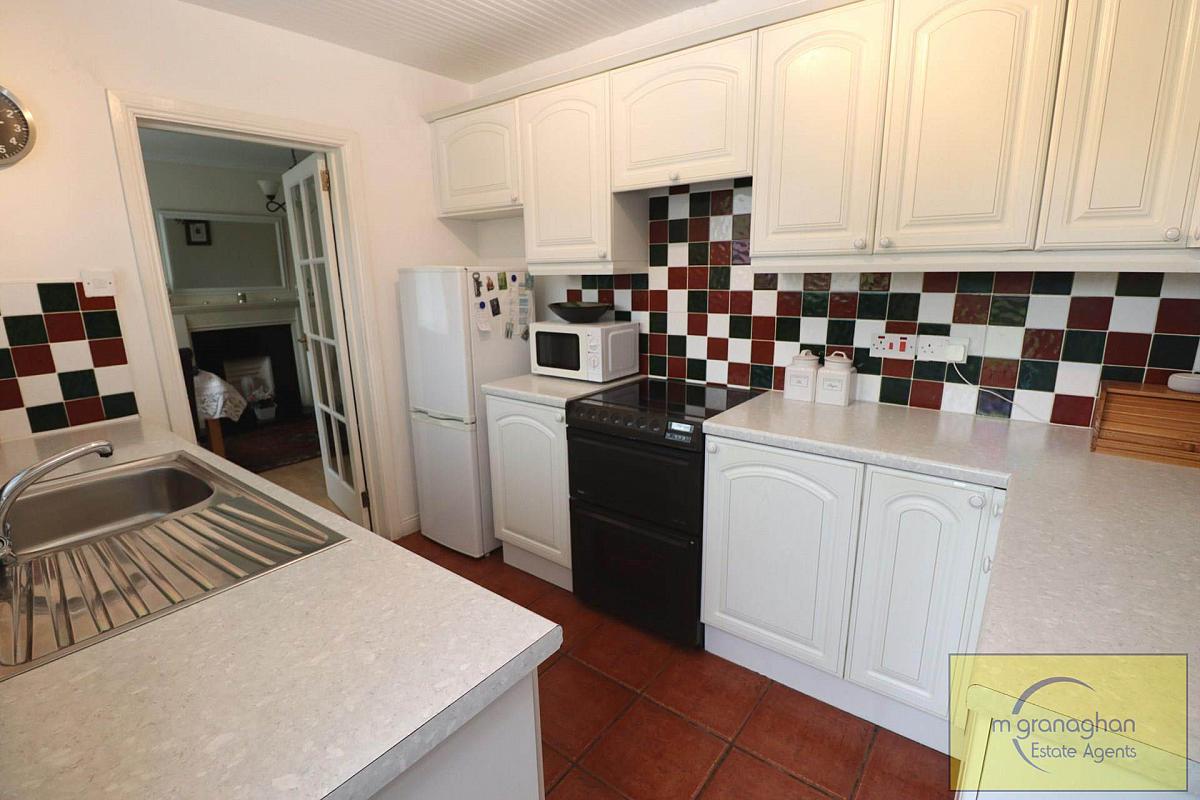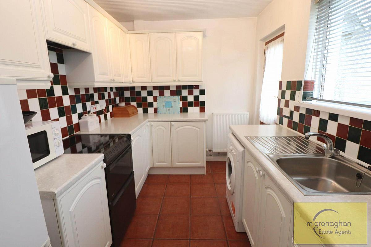 White kitchen with a range of high and low level units, formica work surfaces, stainless steel sink drainer, Space for free standing oven, space for fridge, plumbed for washing machine, part tiled walls, ceramic tiled flooring.