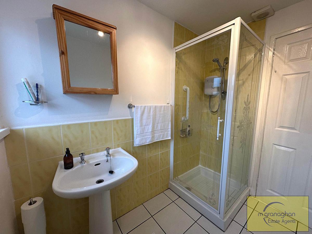 White suite comprising of shower cubicle, low flush WC, pedestal wash hand basin, ceramic tiled flooring, part tiled walls