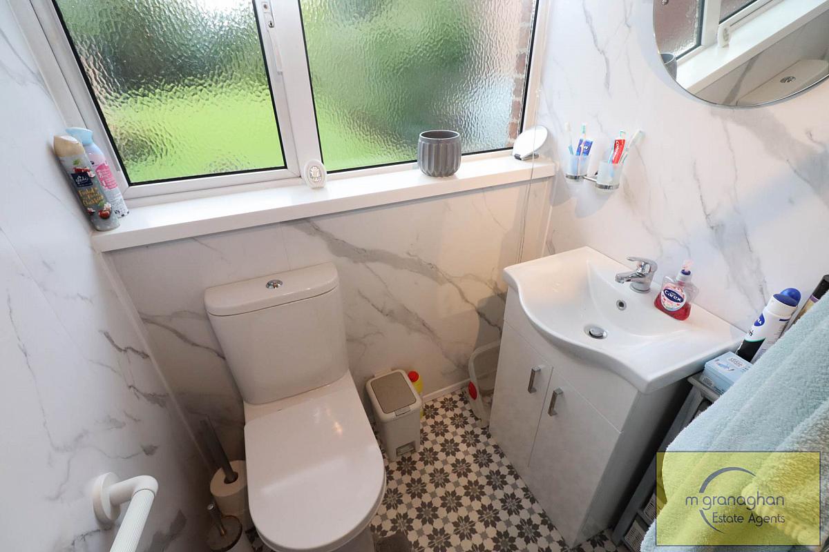 The property features a modern bathroom, complete with a sleek white suite, The bathroom is conveniently located near the downstairs bedroom for easy access.