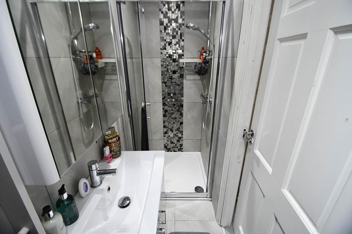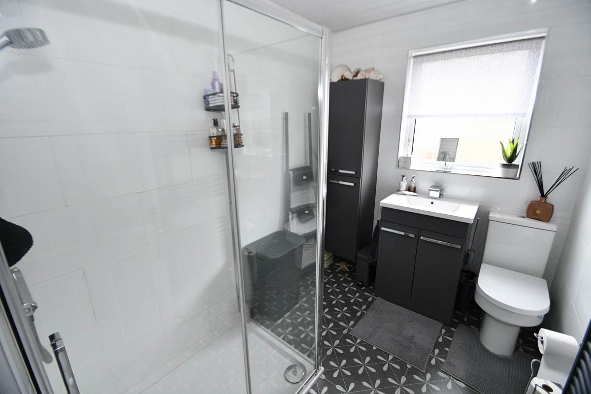 Walk in shower cubicle with overhead shower, vanity unit wash hand basin, low flush W/C, fully tiled walls, ceramic tiled flooring, chrome towel rail, ceiling spotlights