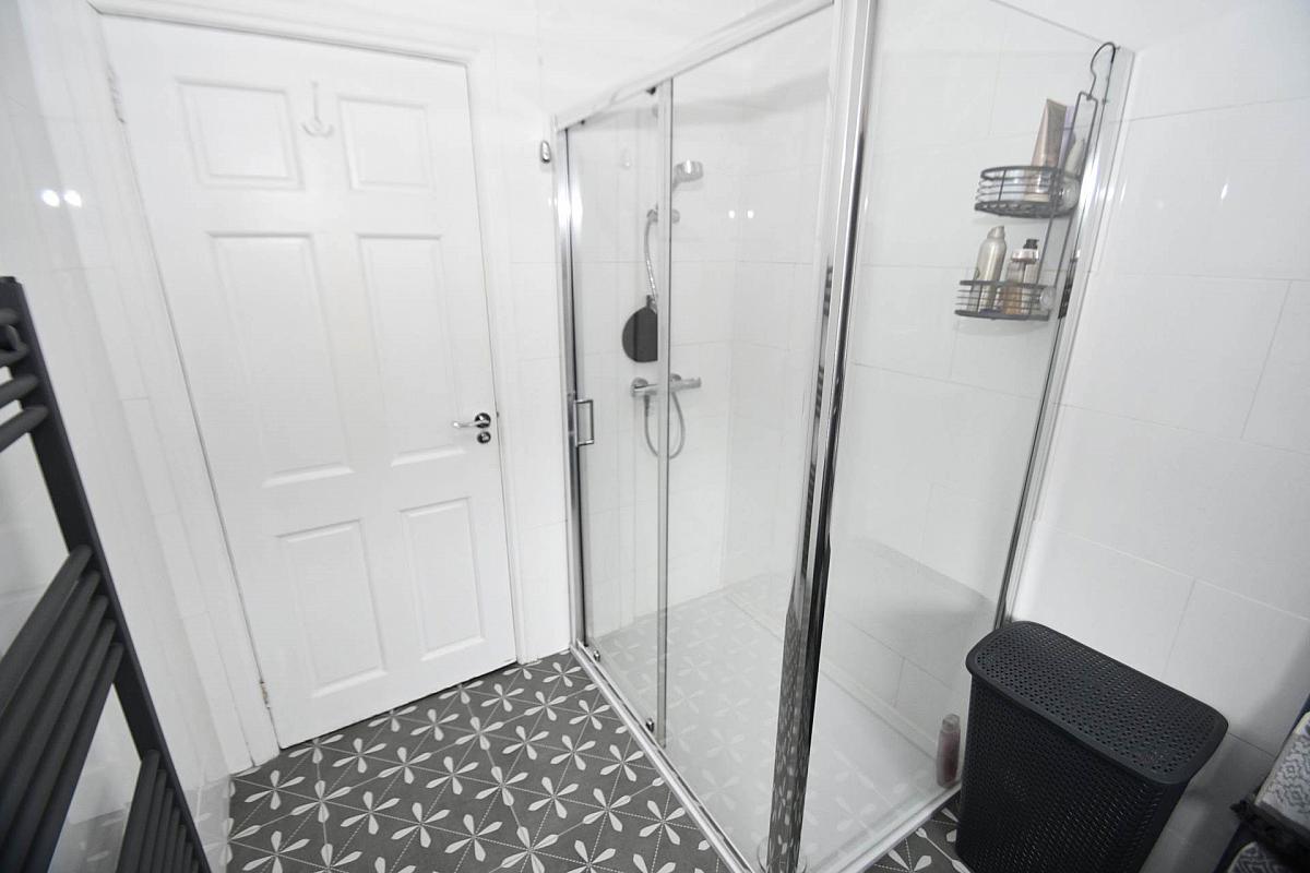 White family bathroom suite with walk in shower cubicle & over head shower screen, vanity unit wash hand basin, low flush W/C, fully tiled walls, ceramic tiled flooring, chrome towel rail, ceiling spotlights