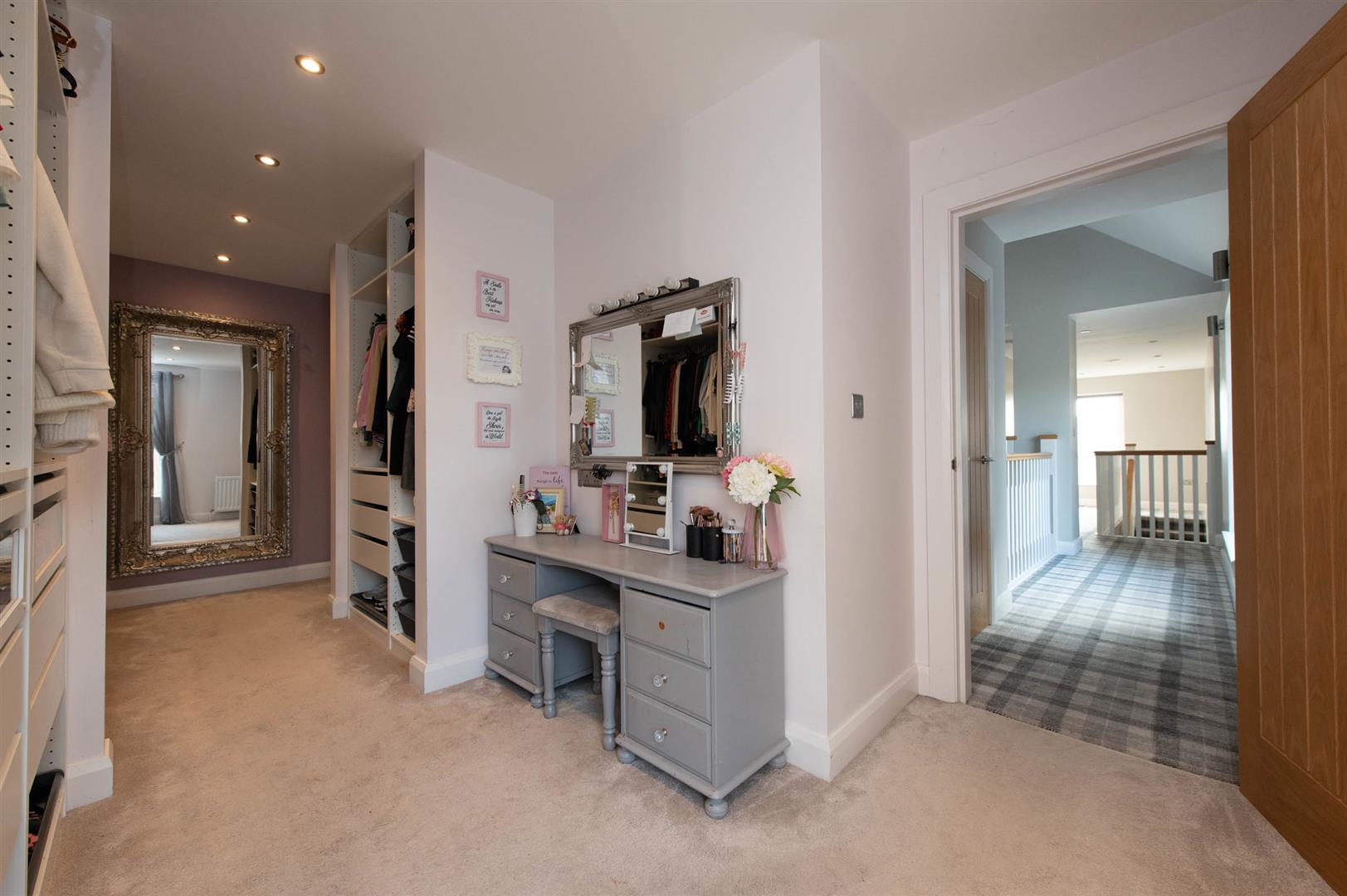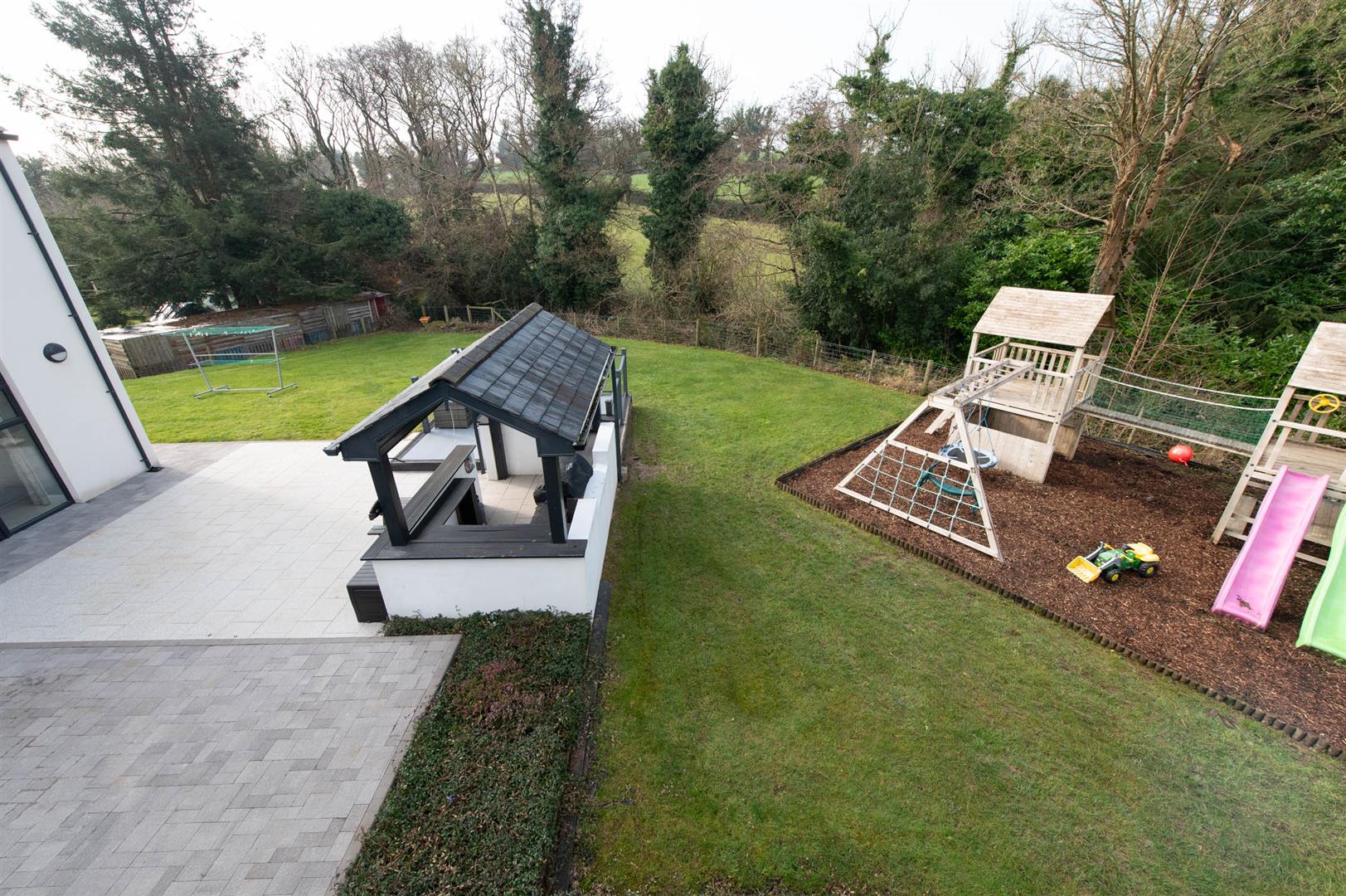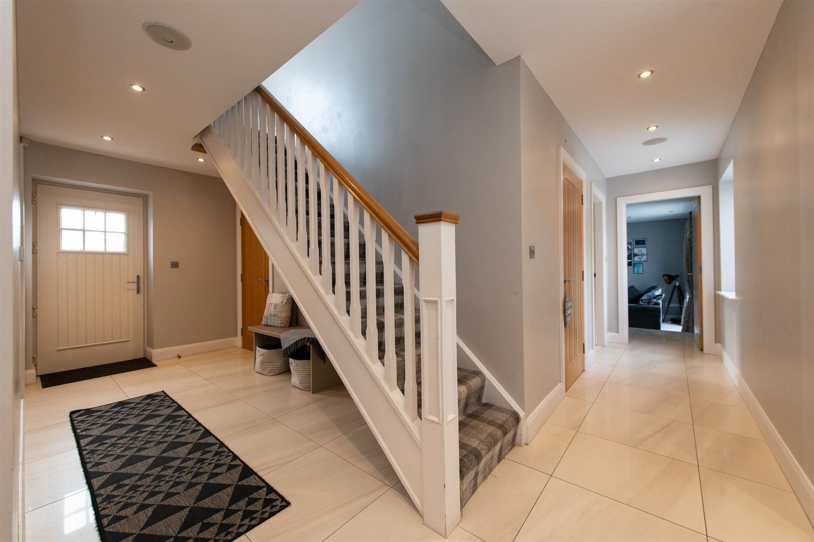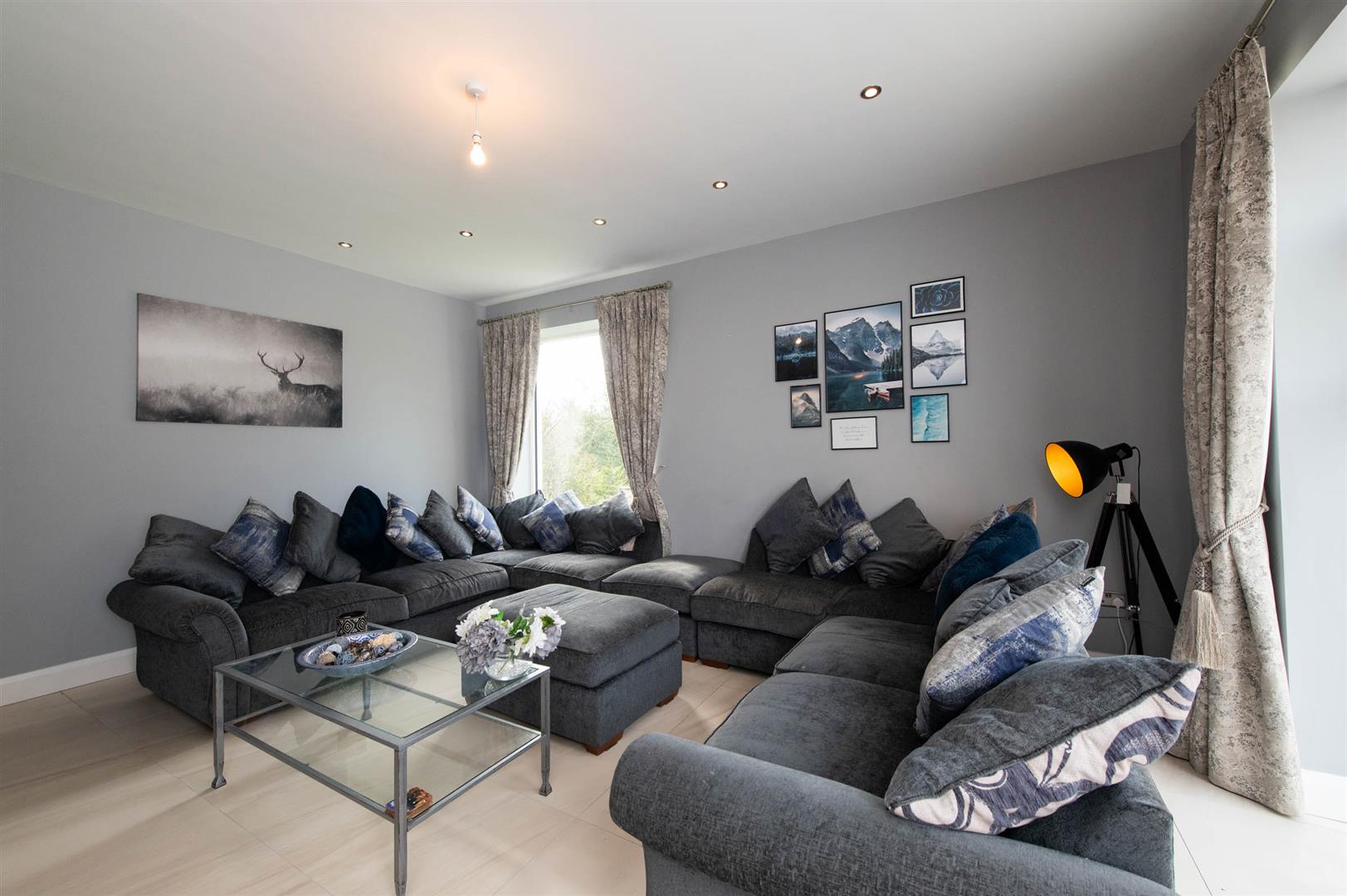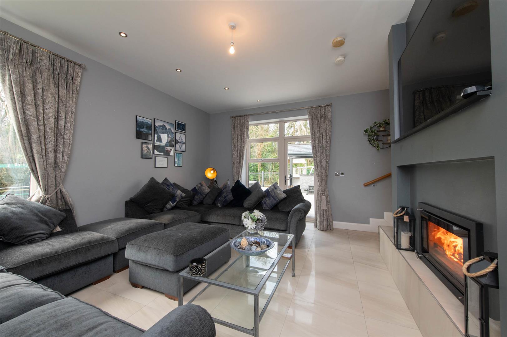 The property comprises bright spacious hallway with featured gallery landing and wall window overlooking the garden, to the right of the hall you access the kitchen, dining living area with featured corner wall windows, bifold doors and inset stove. The kitchen is finished to a high quality with quartz worktops, integrated appliances including hob with built in extractor fan, Galley island with seating, and additional prep sink. There is a recess for an American fridge freezer. To the left of the hallway you have access to the Lounge/Family room with access to the rear garden, featured inset stove and decorative built in shelving. playroom, spacious closet and rear hall leading to the shower room, utility room, integral garage and exterior door. The first floor offers four sizeable bedrooms, with the primary suite offering a dressing area and ensuite and featured pitched ceiling and balcony door overlooking the garden. Tiled family bathroom with freestanding bath and walk-in shower enclosure.