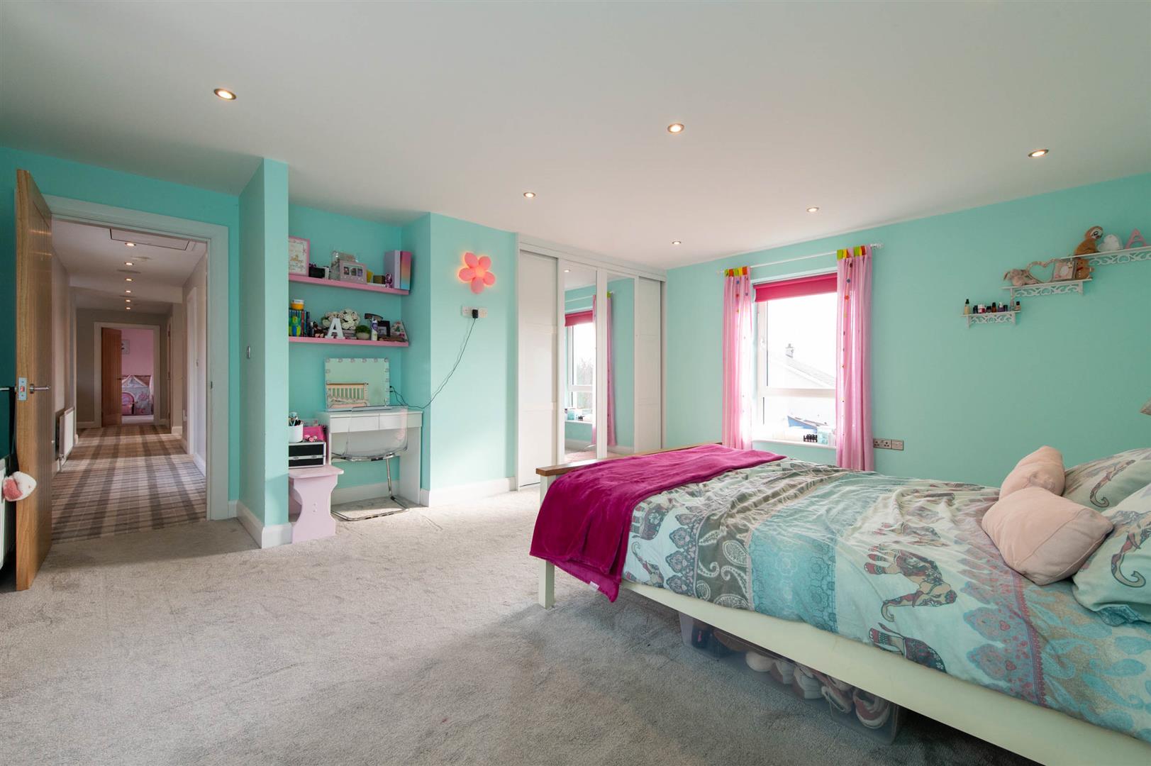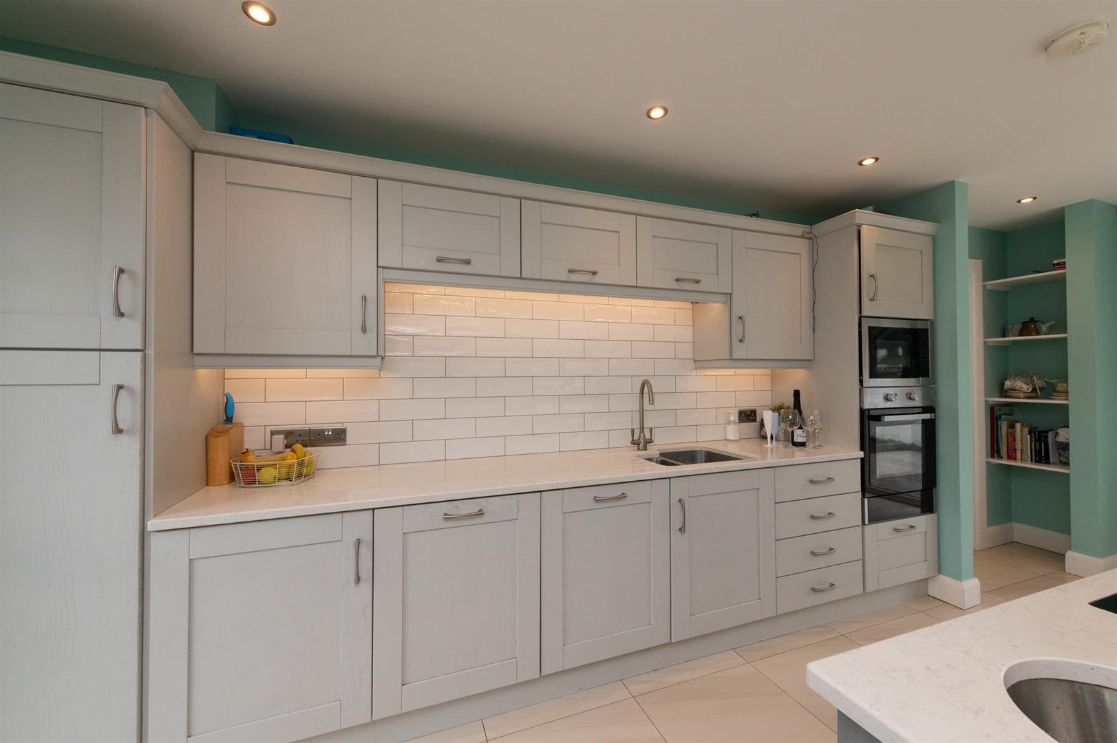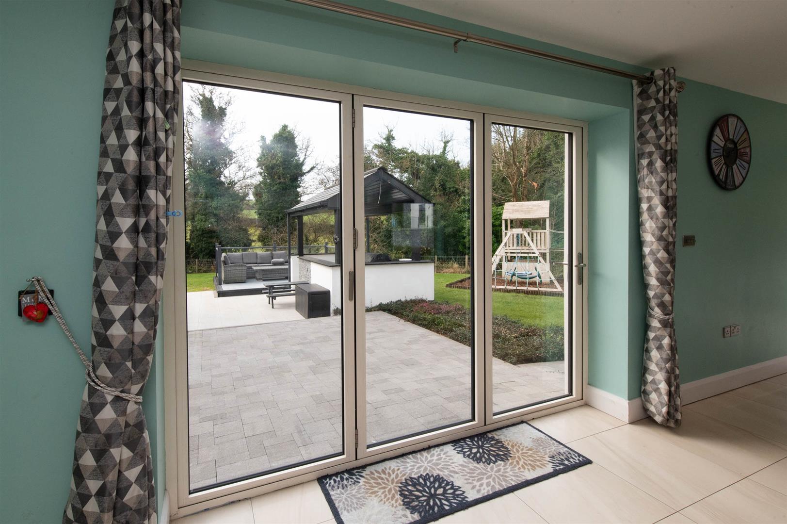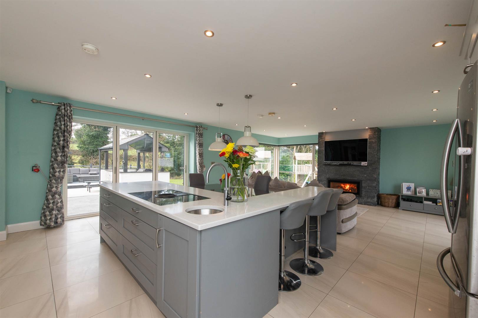 The property comprises bright spacious hallway with featured gallery landing and wall window overlooking the garden, to the right of the hall you access the kitchen, dining living area with featured corner wall windows, bifold doors and inset stove. The kitchen is finished to a high quality with quartz worktops, integrated appliances including hob with built in extractor fan, Galley island with seating, and additional prep sink. There is a recess for an American fridge freezer. To the left of the hallway you have access to the Lounge/Family room with access to the rear garden, featured inset stove and decorative built in shelving. playroom, spacious closet and rear hall leading to the shower room, utility room, integral garage and exterior door. The first floor offers four sizeable bedrooms, with the primary suite offering a dressing area and ensuite and featured pitched ceiling and balcony door overlooking the garden. Tiled family bathroom with freestanding bath and walk-in shower enclosure.
