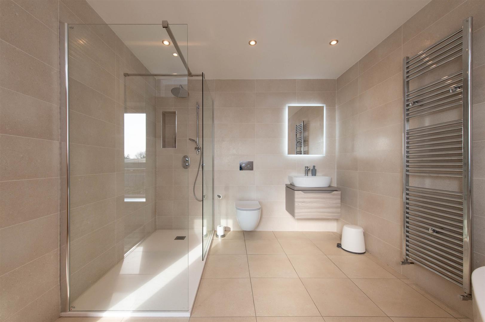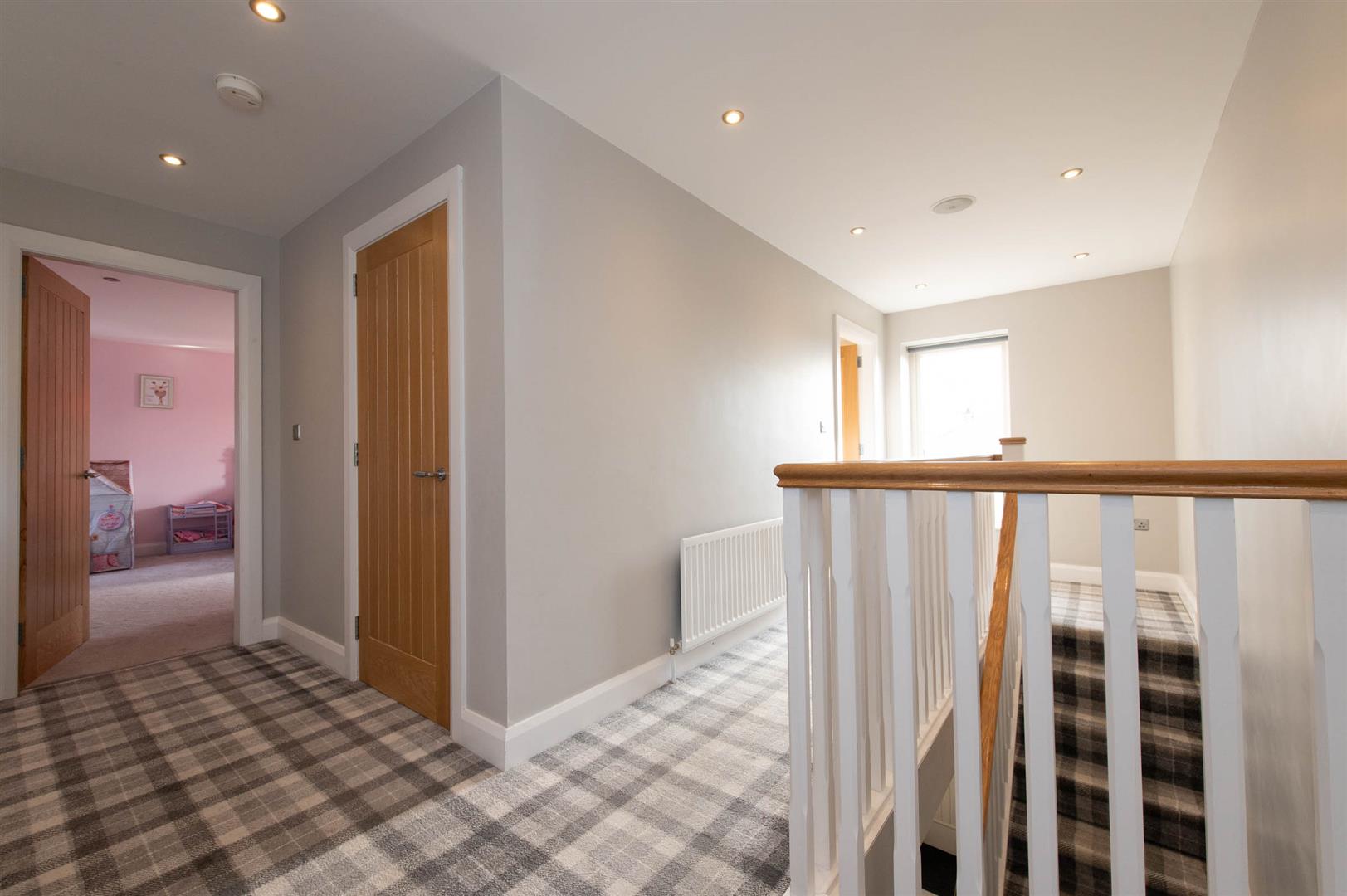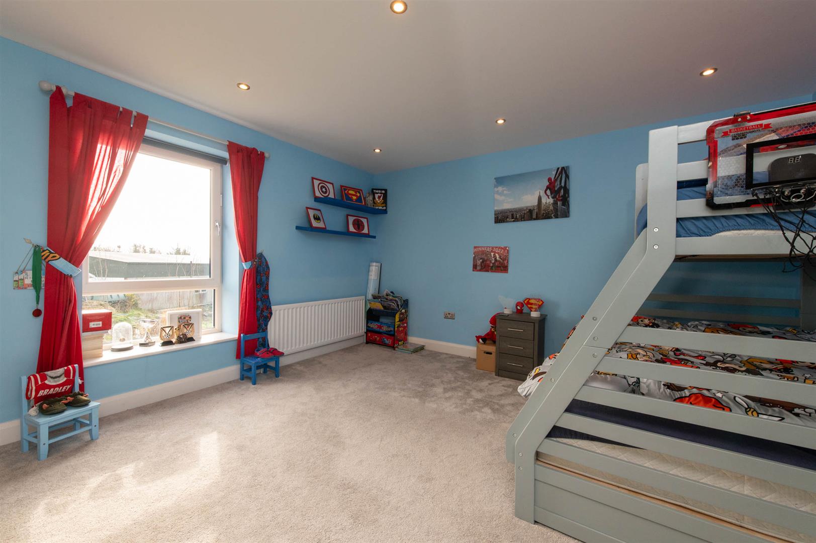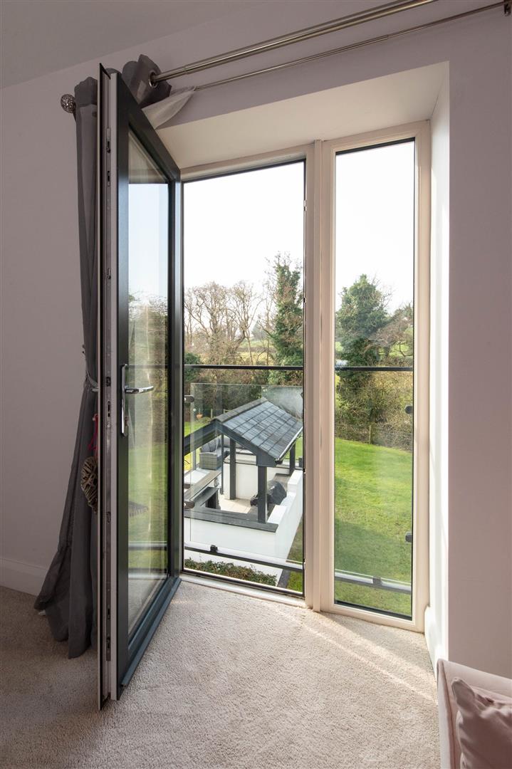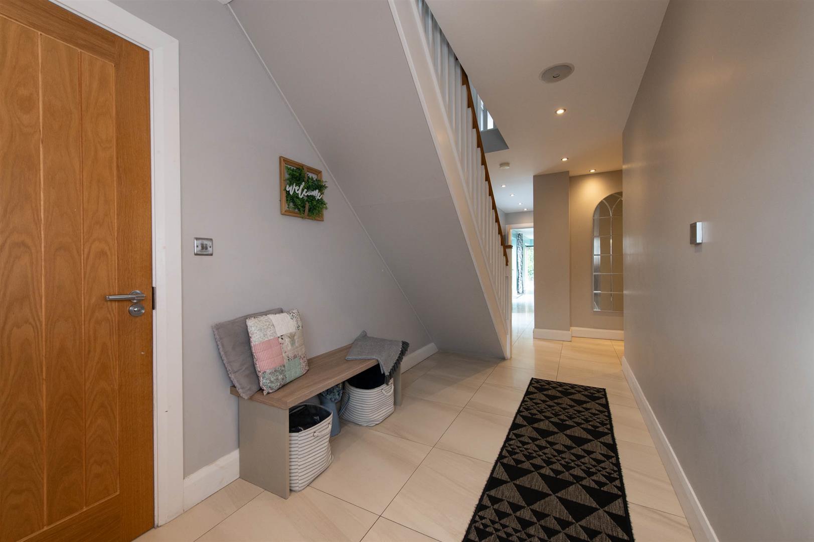 The property comprises bright spacious hallway with featured gallery landing and wall window overlooking the garden, to the right of the hall you access the kitchen, dining living area with featured corner wall windows, bifold doors and inset stove. The kitchen is finished to a high quality with quartz worktops, integrated appliances including hob with built in extractor fan, Galley island with seating, and additional prep sink. There is a recess for an American fridge freezer. To the left of the hallway you have access to the Lounge/Family room with access to the rear garden, featured inset stove and decorative built in shelving. playroom, spacious closet and rear hall leading to the shower room, utility room, integral garage and exterior door. The first floor offers four sizeable bedrooms, with the primary suite offering a dressing area and ensuite and featured pitched ceiling and balcony door overlooking the garden. Tiled family bathroom with freestanding bath and walk-in shower enclosure.