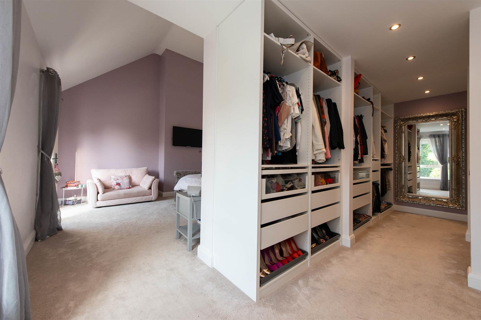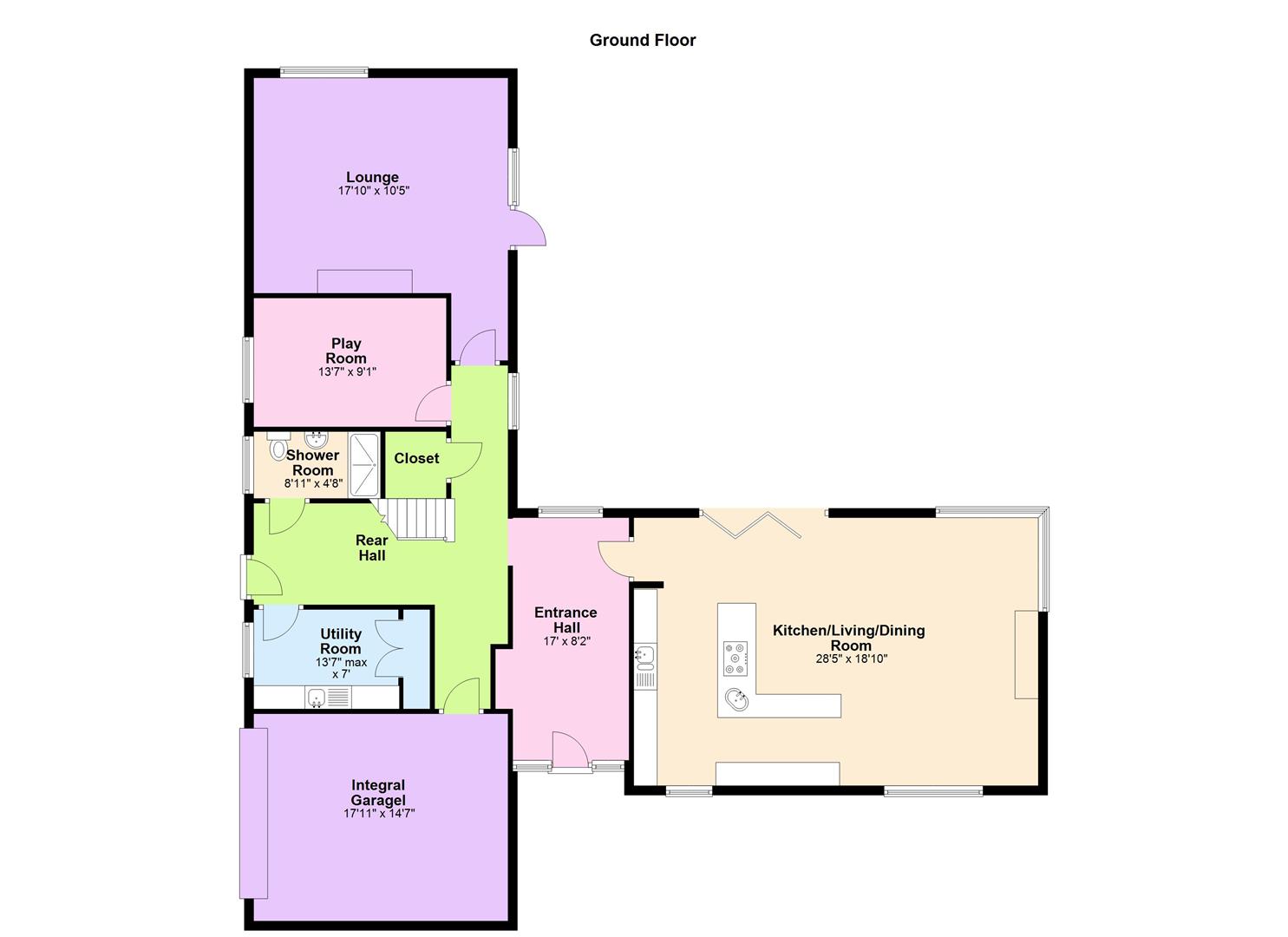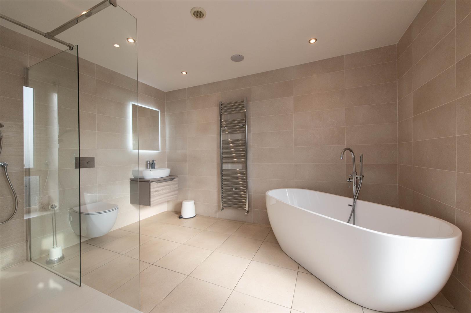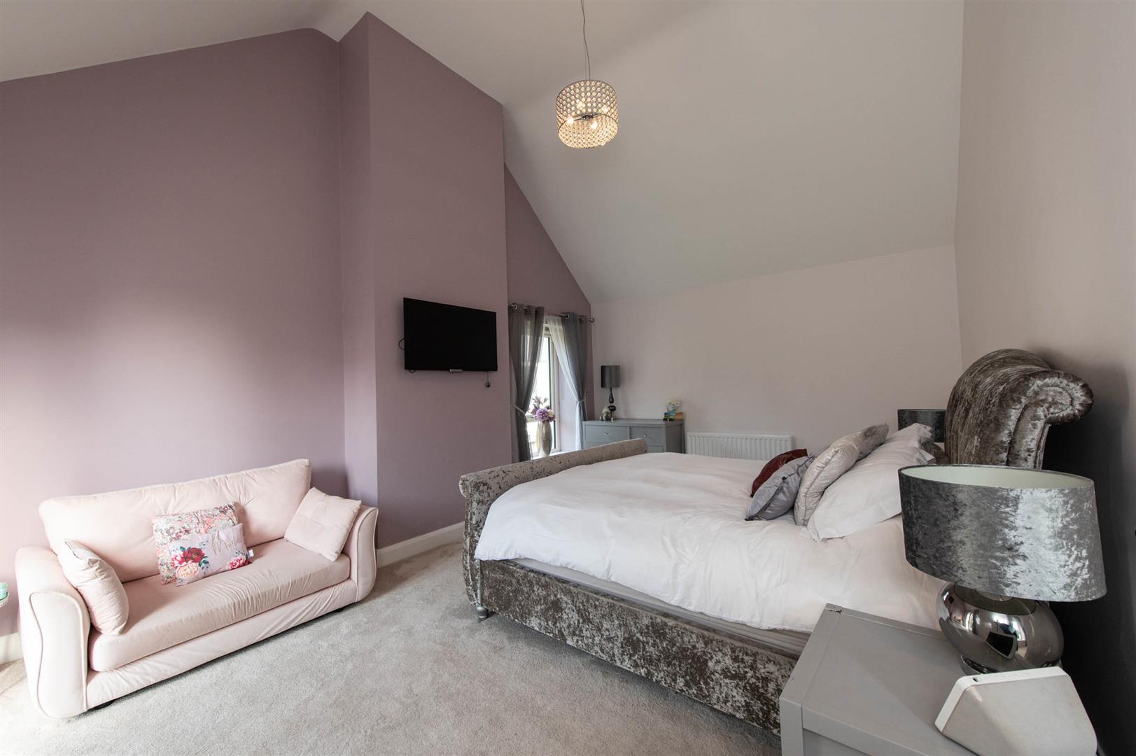 The property comprises bright spacious hallway with featured gallery landing and wall window overlooking the garden, to the right of the hall you access the kitchen, dining living area with featured corner wall windows, bifold doors and inset stove. The kitchen is finished to a high quality with quartz worktops, integrated appliances including hob with built in extractor fan, Galley island with seating, and additional prep sink. There is a recess for an American fridge freezer. To the left of the hallway you have access to the Lounge/Family room with access to the rear garden, featured inset stove and decorative built in shelving. playroom, spacious closet and rear hall leading to the shower room, utility room, integral garage and exterior door. The first floor offers four sizeable bedrooms, with the primary suite offering a dressing area and ensuite and featured pitched ceiling and balcony door overlooking the garden. Tiled family bathroom with freestanding bath and walk-in shower enclosure.